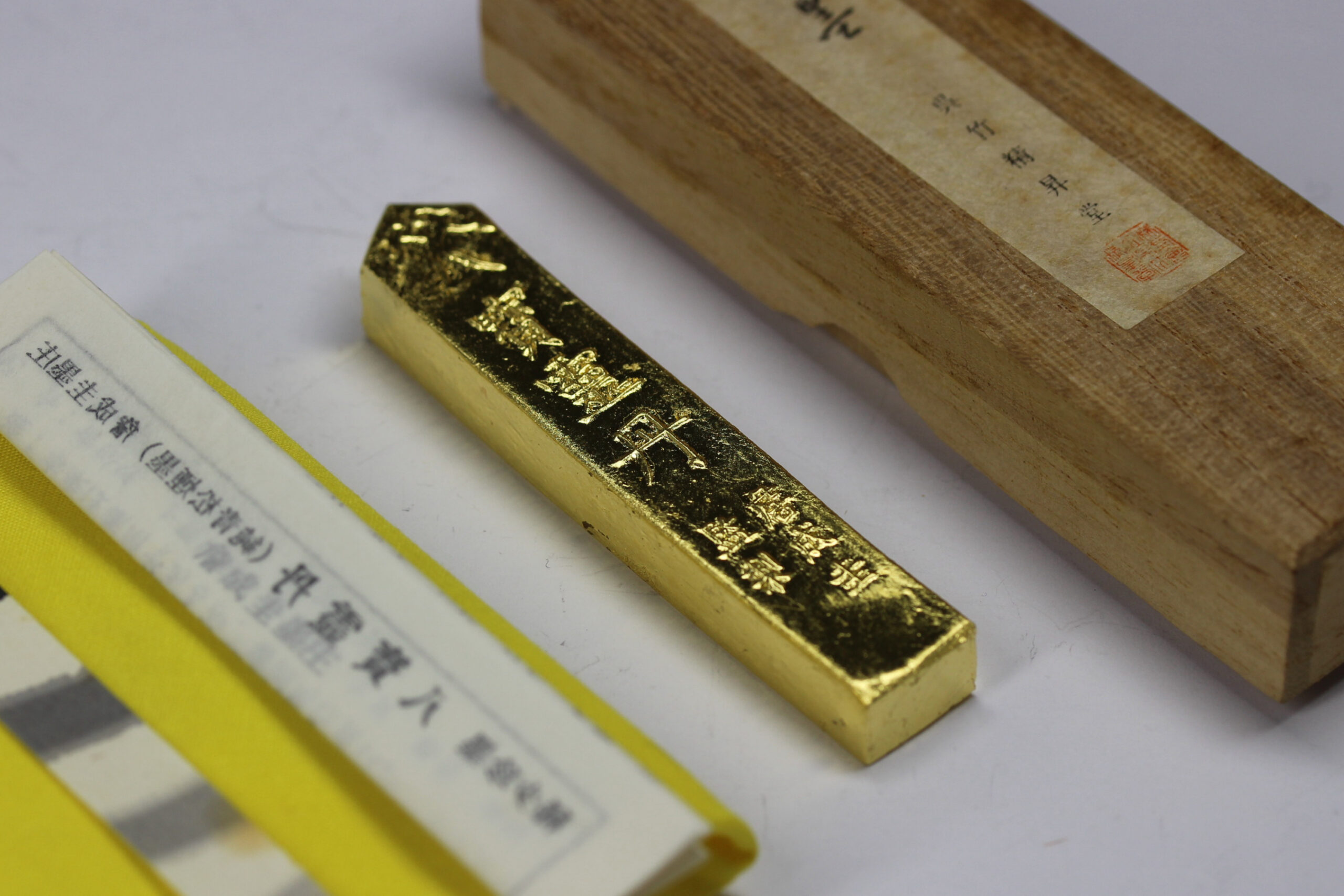 [玄清堂]和墨 呉竹精昇堂 稀少珍墨 「八寶霊丹」 純金箔巻 純青松煙墨 青墨 詹成圭監製 0.8丁型 12g 未使用 桐箱【文房四宝】