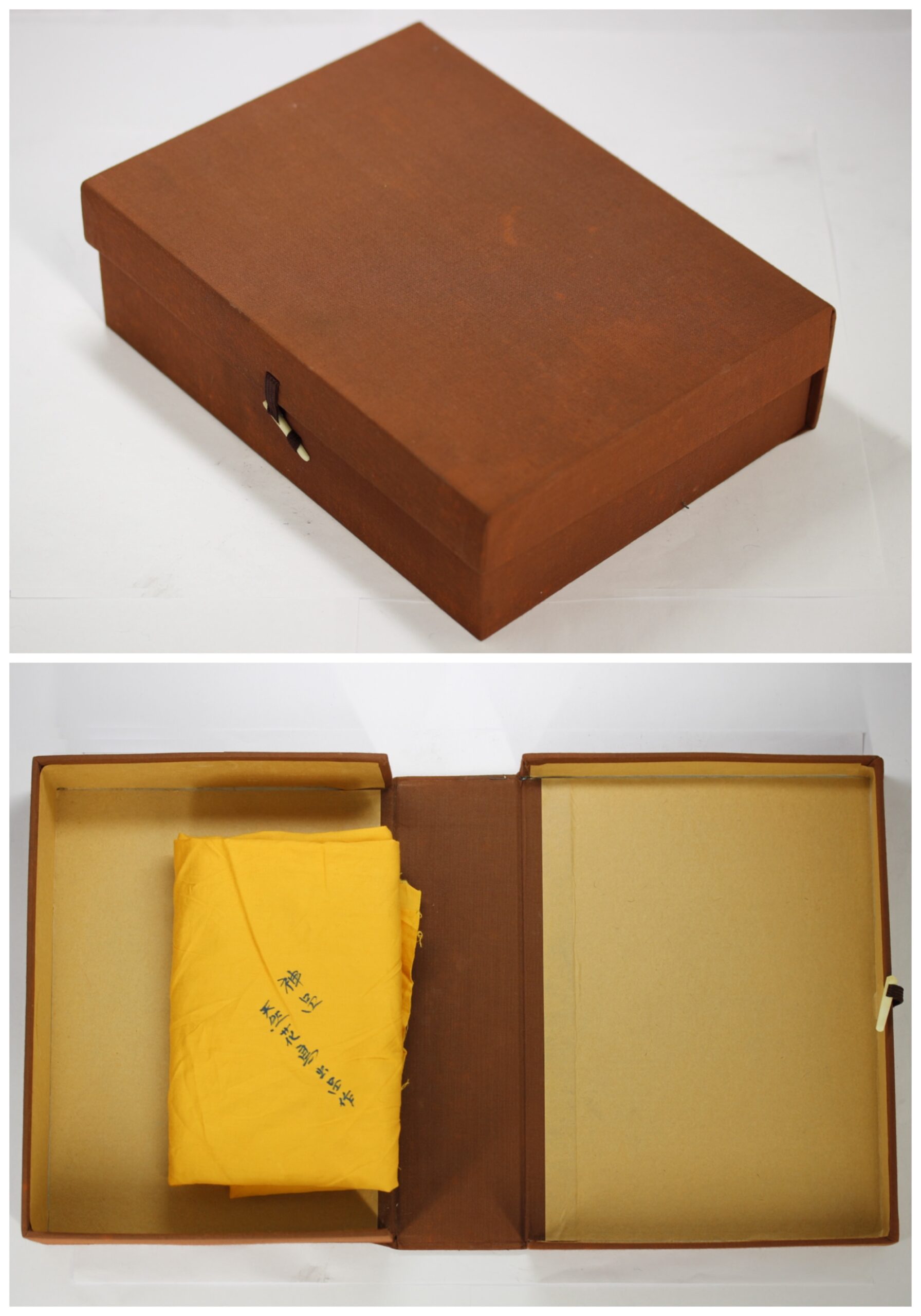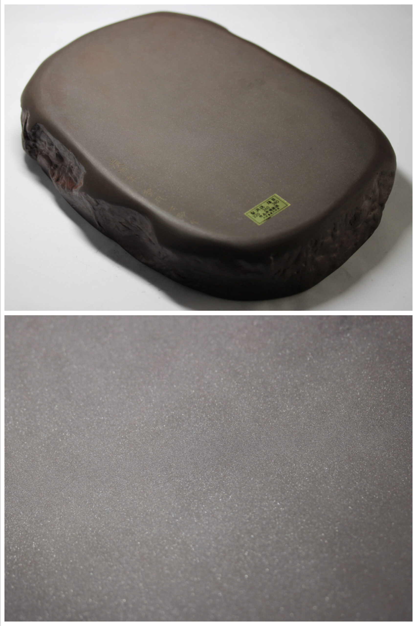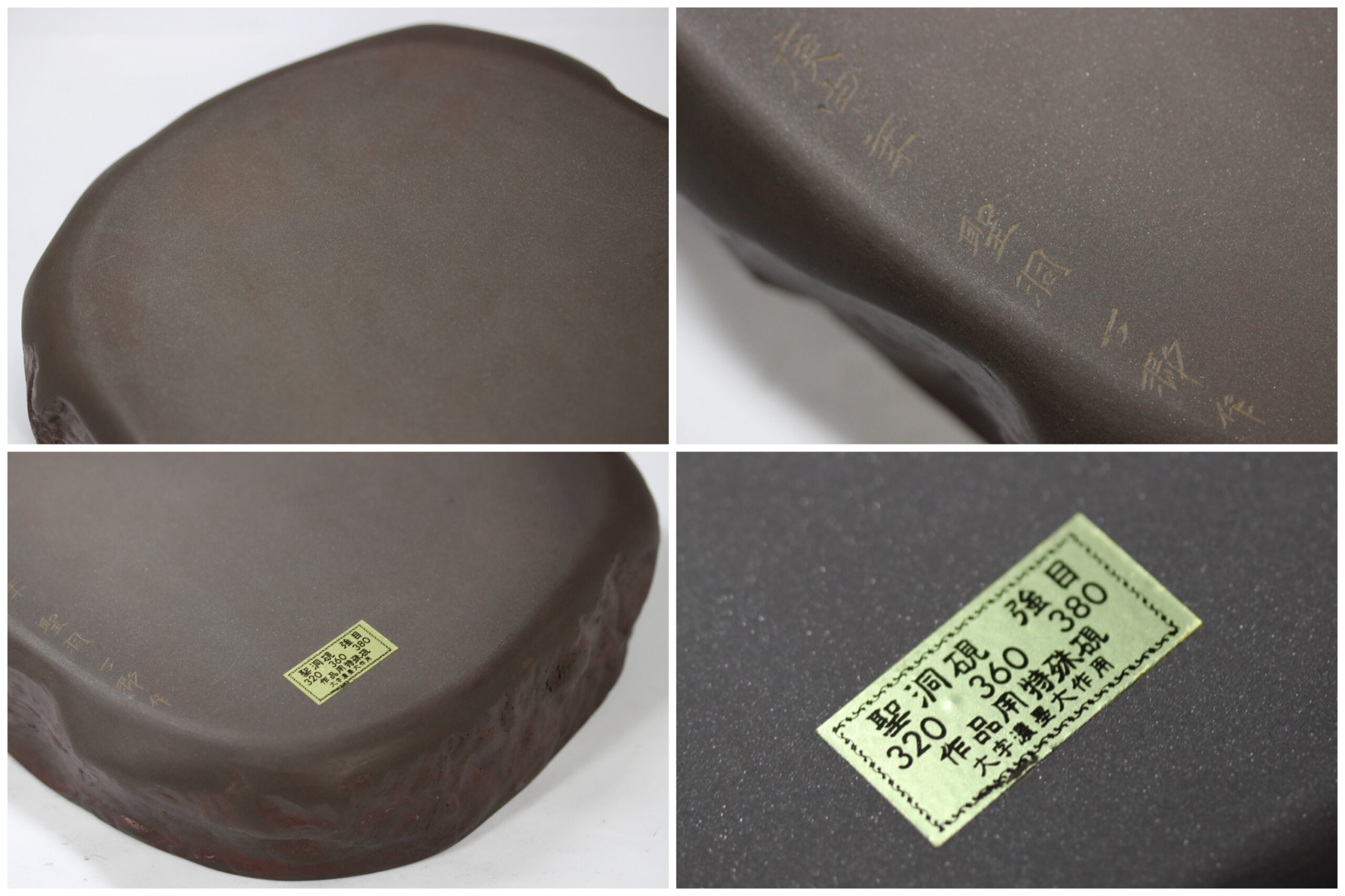 本硯の硯背には、「庚申年 聖洞 丁郷作」の銘あり。1980年(昭和55年)作。シールには、「聖洞硯 強目 320 360 380 作品用特殊硯 大字濃墨大作用」と記されている。共布には「神品 天然花鳥出品作」と記されている。