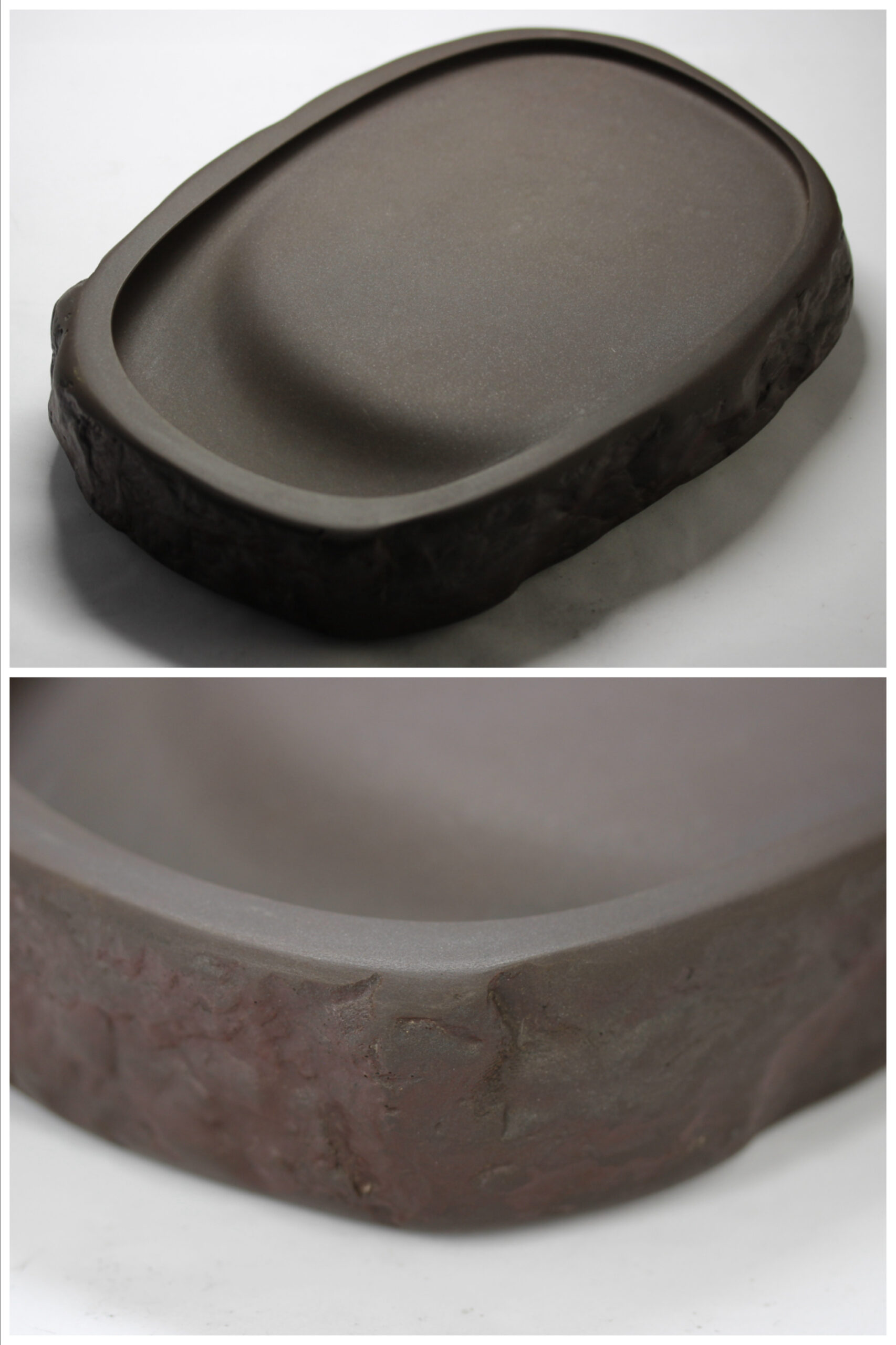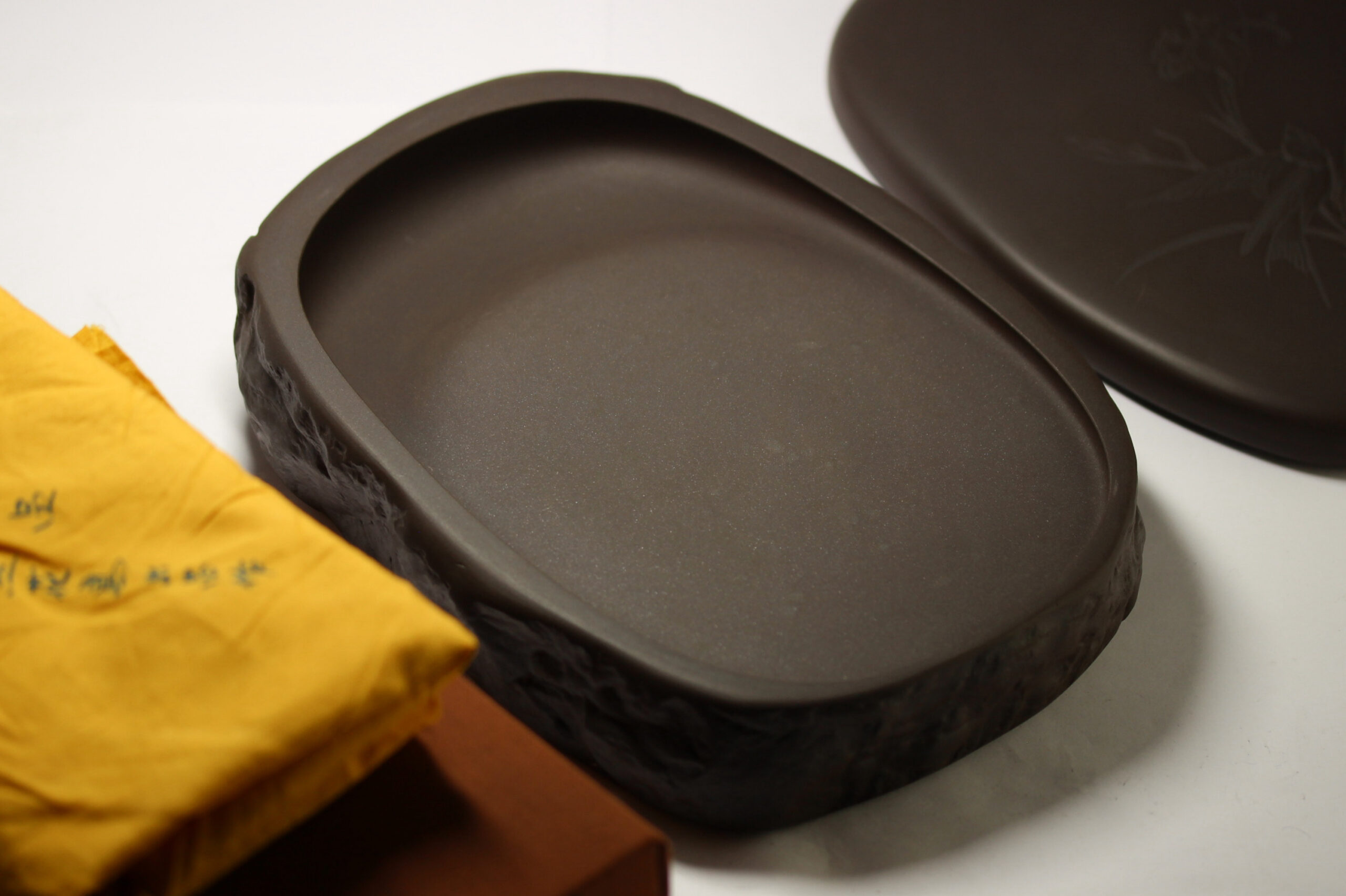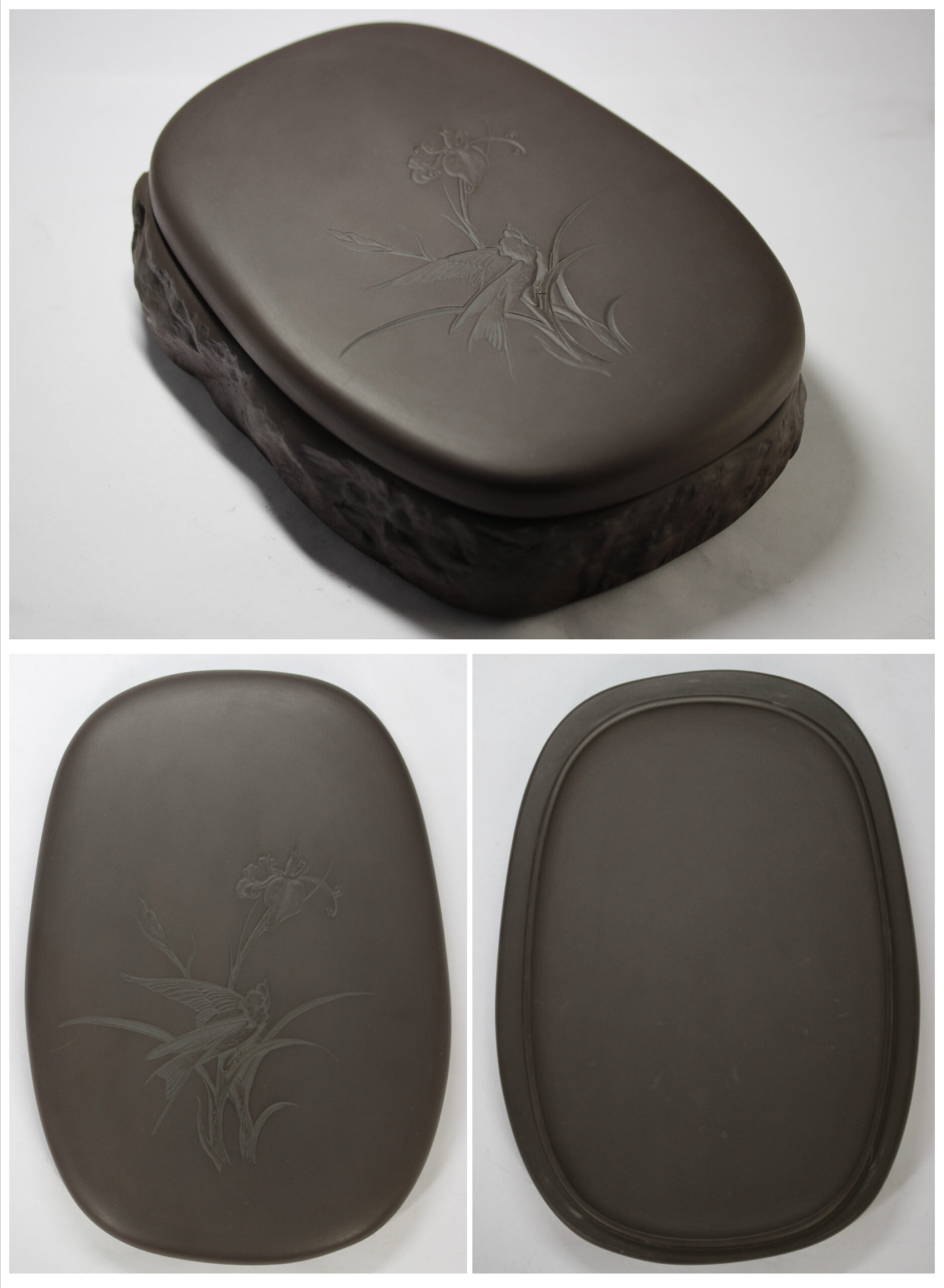 八寸天然花鳥三能硯蓋。雨畑硯、龍渓硯の名作硯家 川口丁郷氏が天然材を超える優れた鋒鋩の硯の研究の末、開発した新澄泥硯の名硯。抜群の磨墨、発墨、発色性能があり、手島右卿、上田桑鳩他一流書家が絶賛し、愛用しました。
