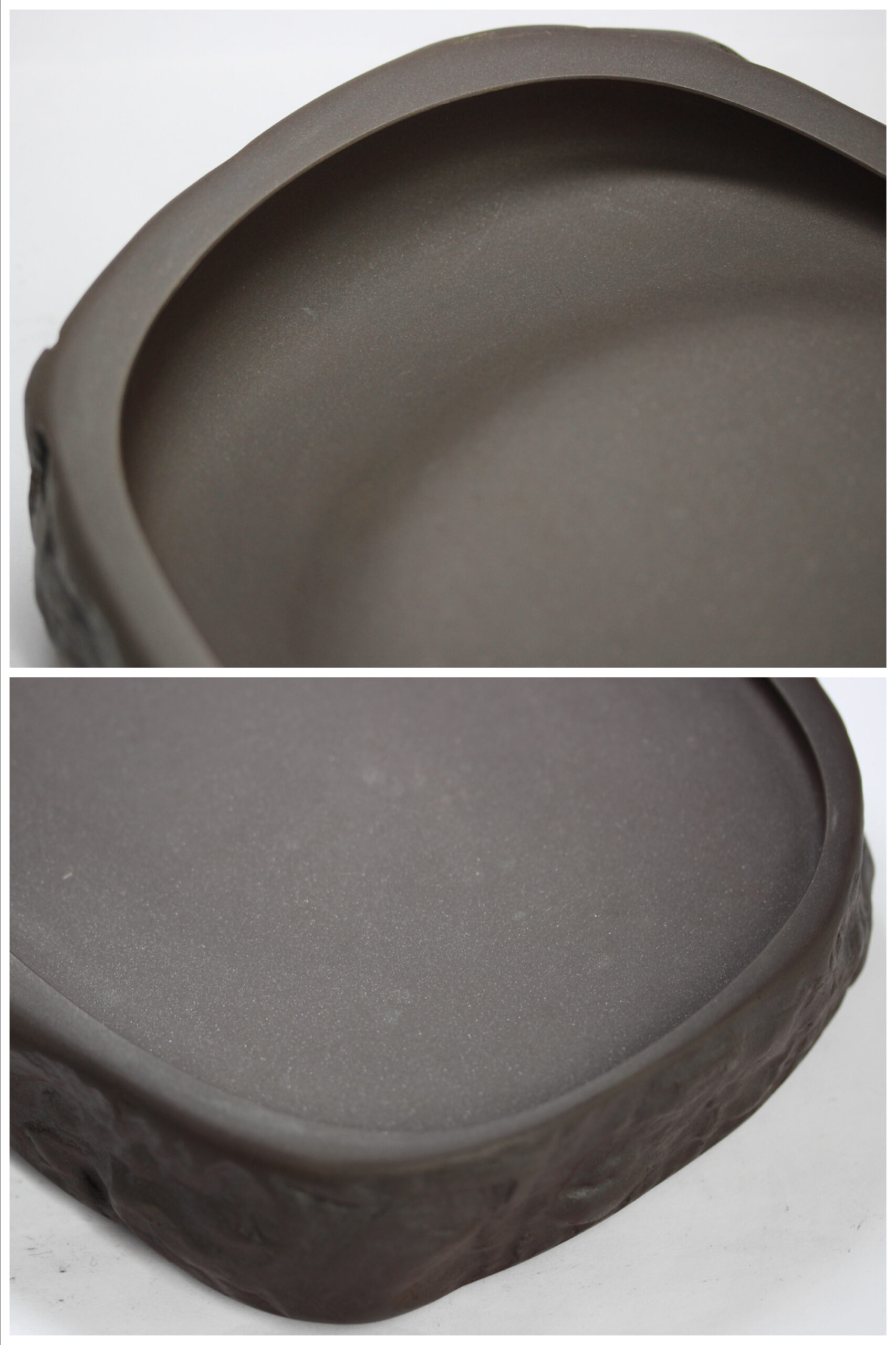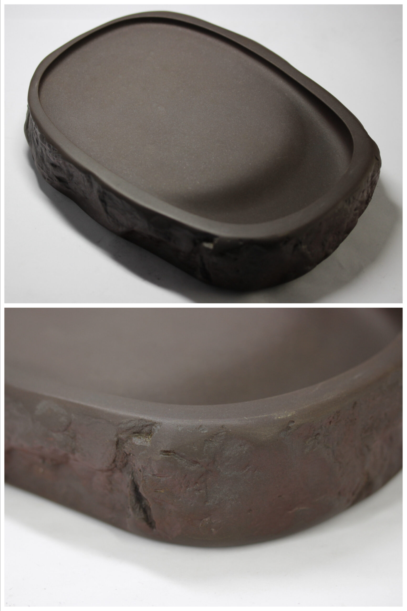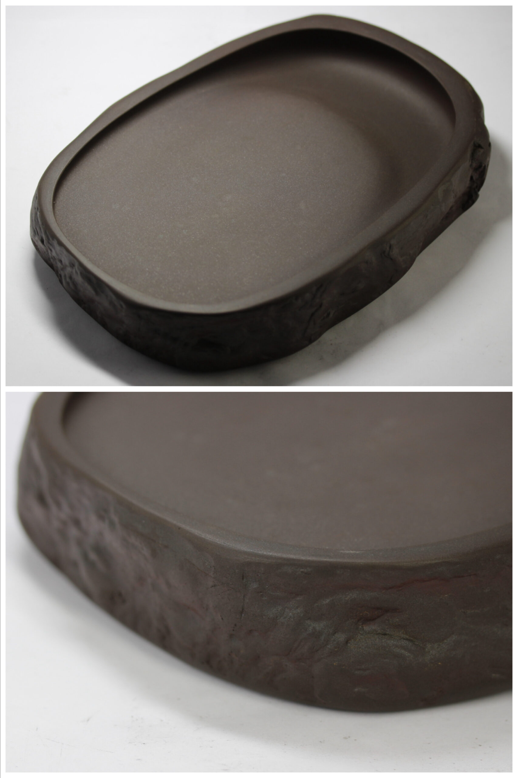 八寸天然花鳥三能硯蓋。雨畑硯、龍渓硯の名作硯家 川口丁郷氏が天然材を超える優れた鋒鋩の硯の研究の末、開発した新澄泥硯の名硯。抜群の磨墨、発墨、発色性能があり、手島右卿、上田桑鳩他一流書家が絶賛し、愛用しました。