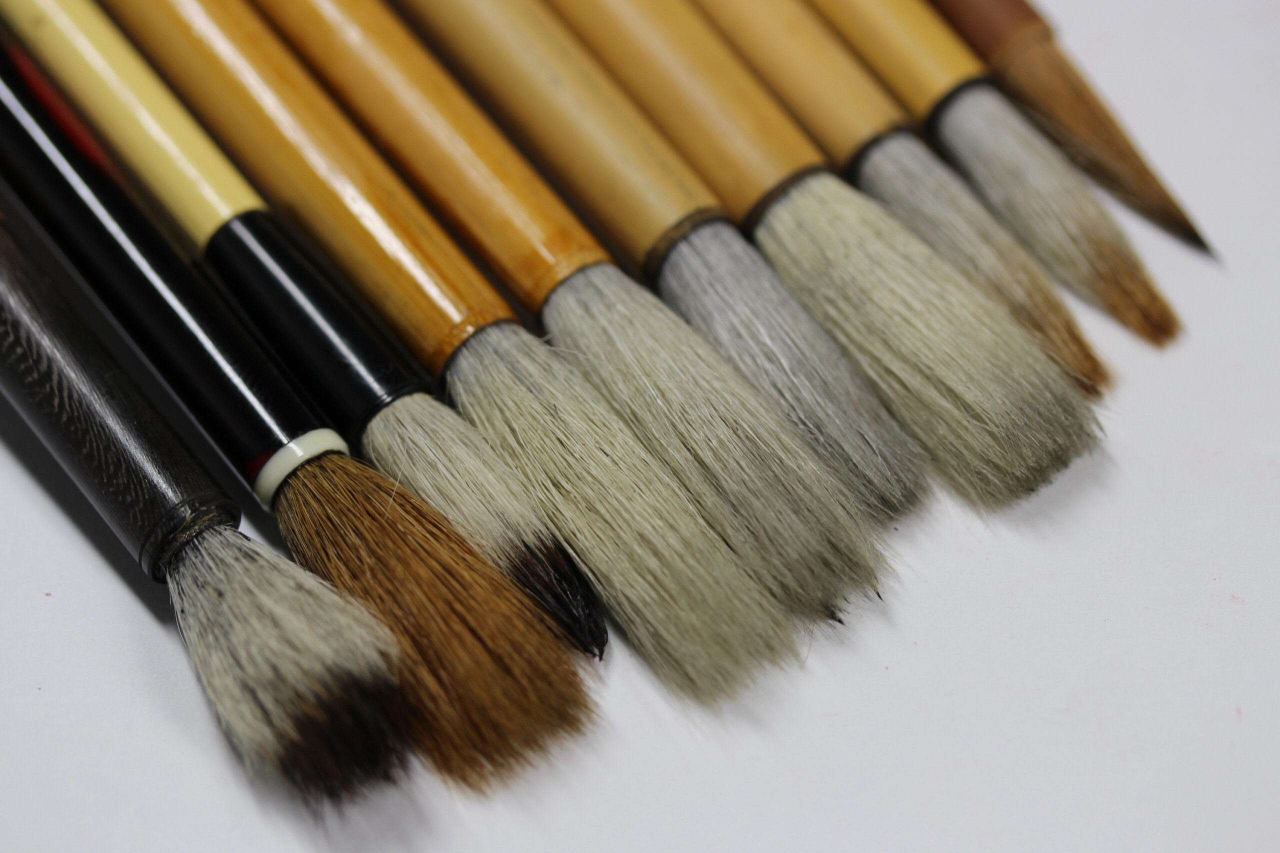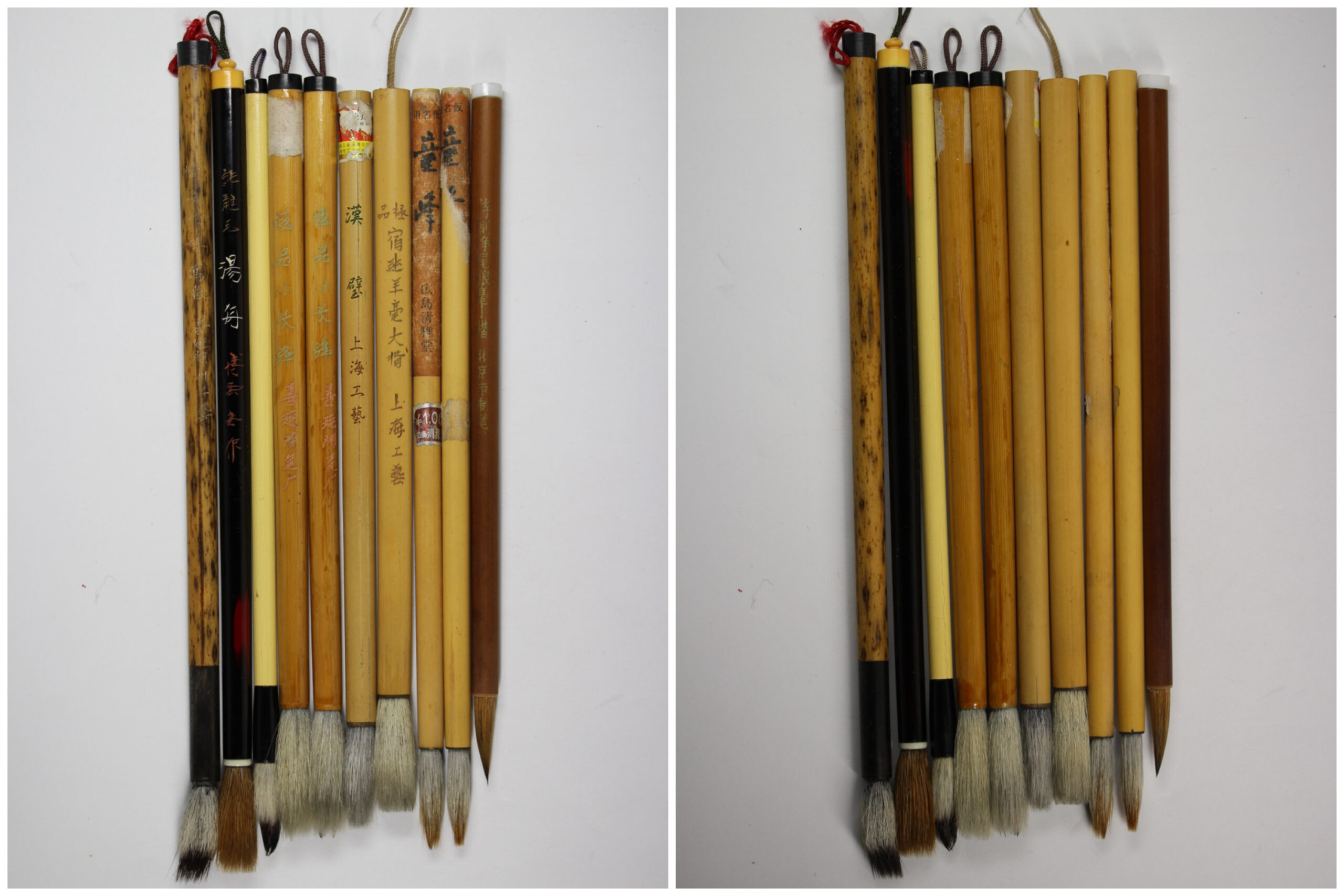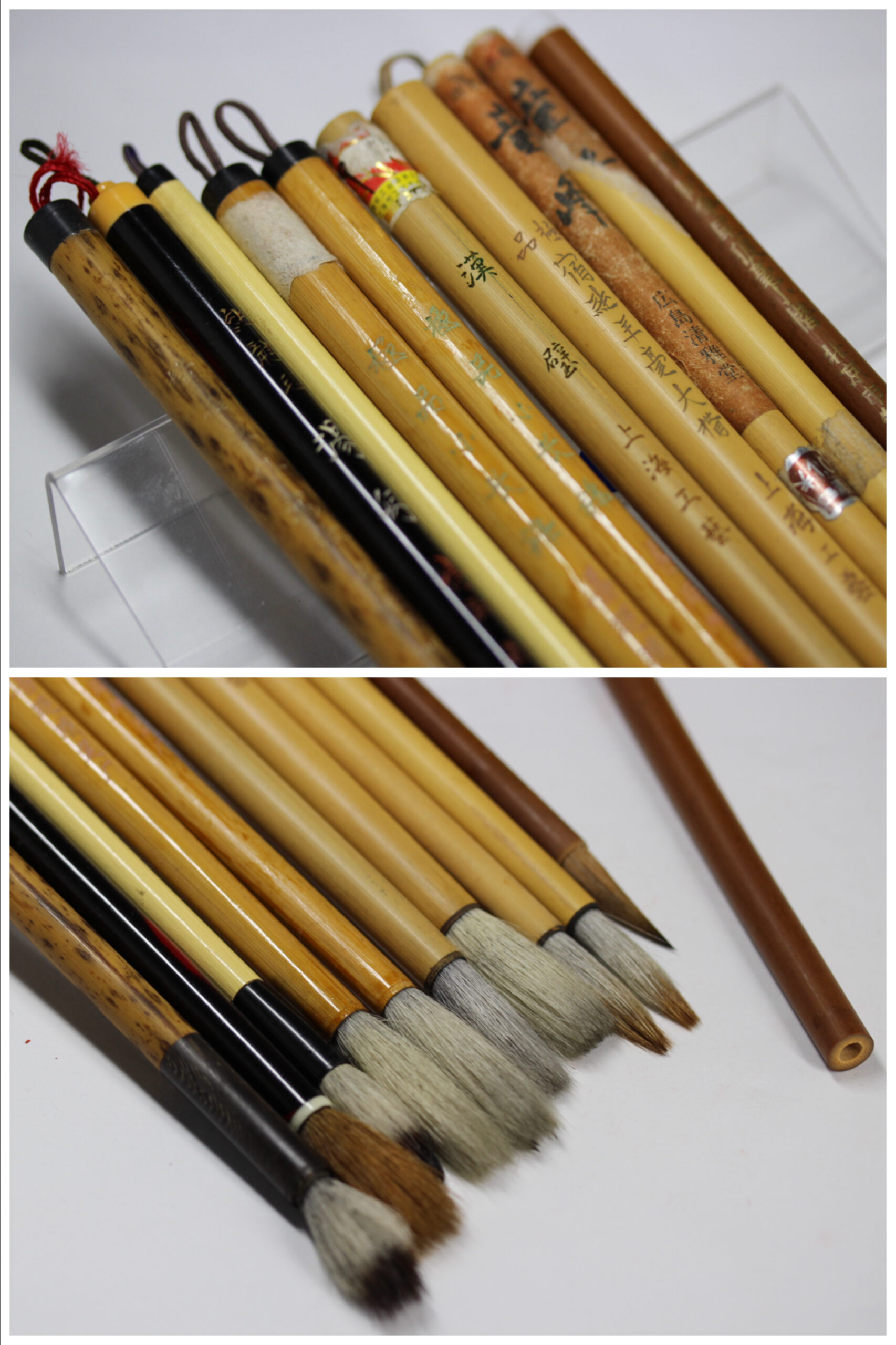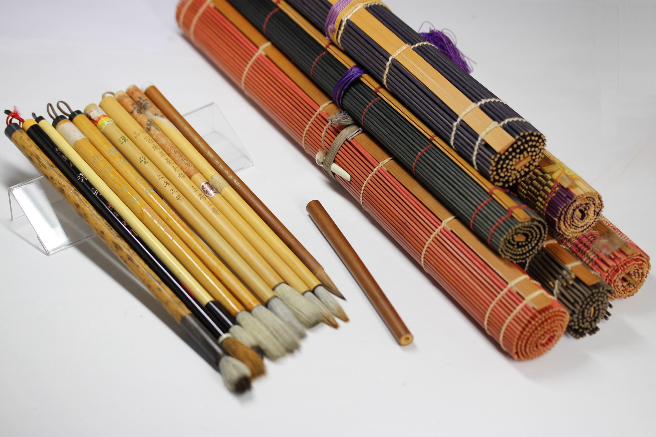 書家旧蔵。使用筆、使用筆巻。筆10本(唐筆6本、和筆3本、無銘1本)、筆巻6点。