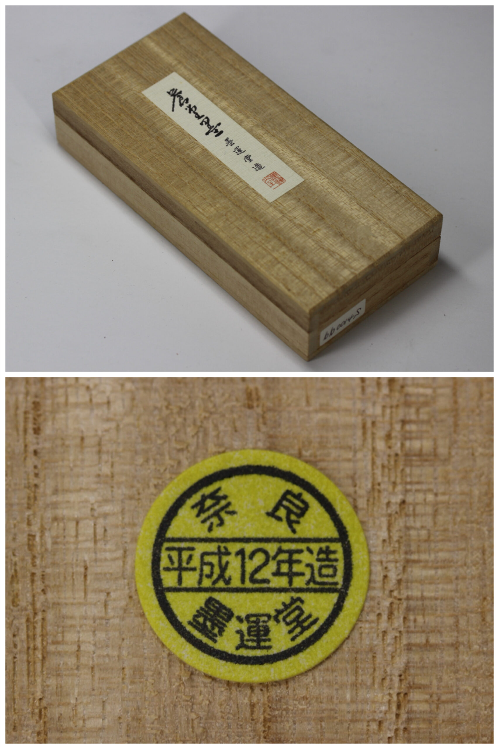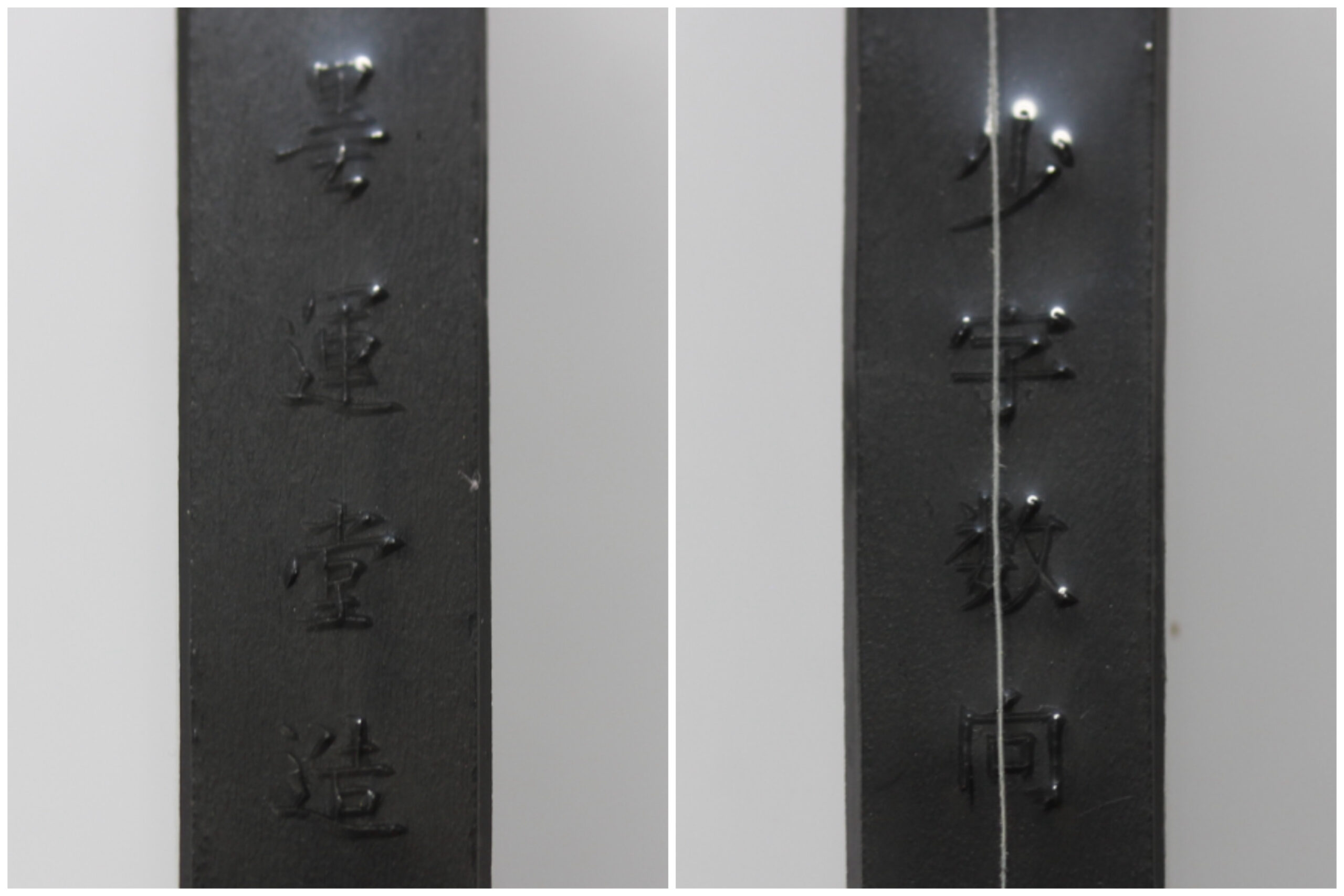 体質的には炭素粒子を最大限度に分散させ、柔らかい感じを作り芯を美しく地味に、滲みを明るく派手に落ち着いた美しさを目的に造りました。一寸弱々しいという感じがしないではないですが、年を経て古くなるにつれ、洗練された美しい墨色になると思います。淡墨向きの墨で色彩的には青みのやや強い中に赤みを帯びた上品な青墨。