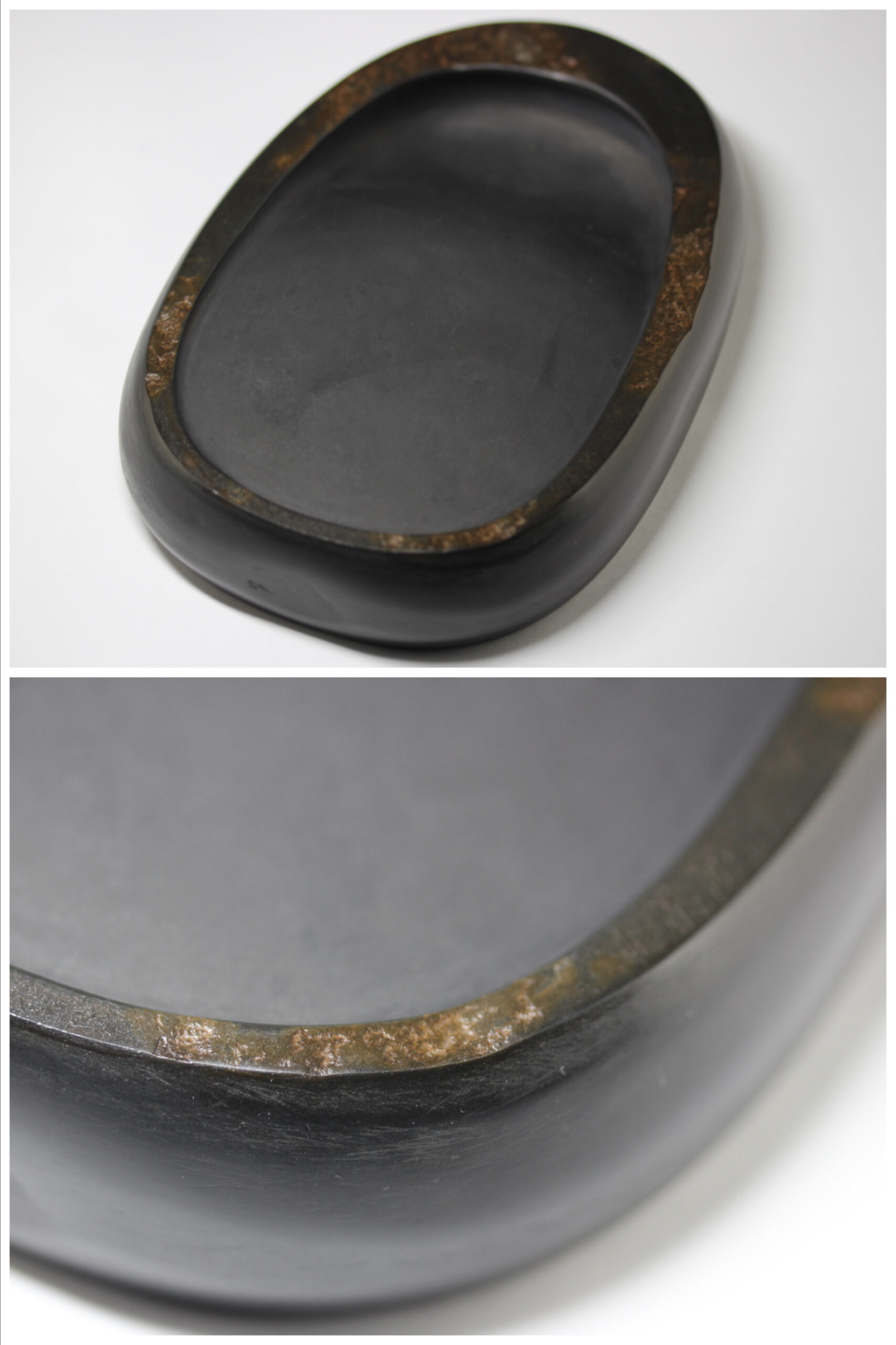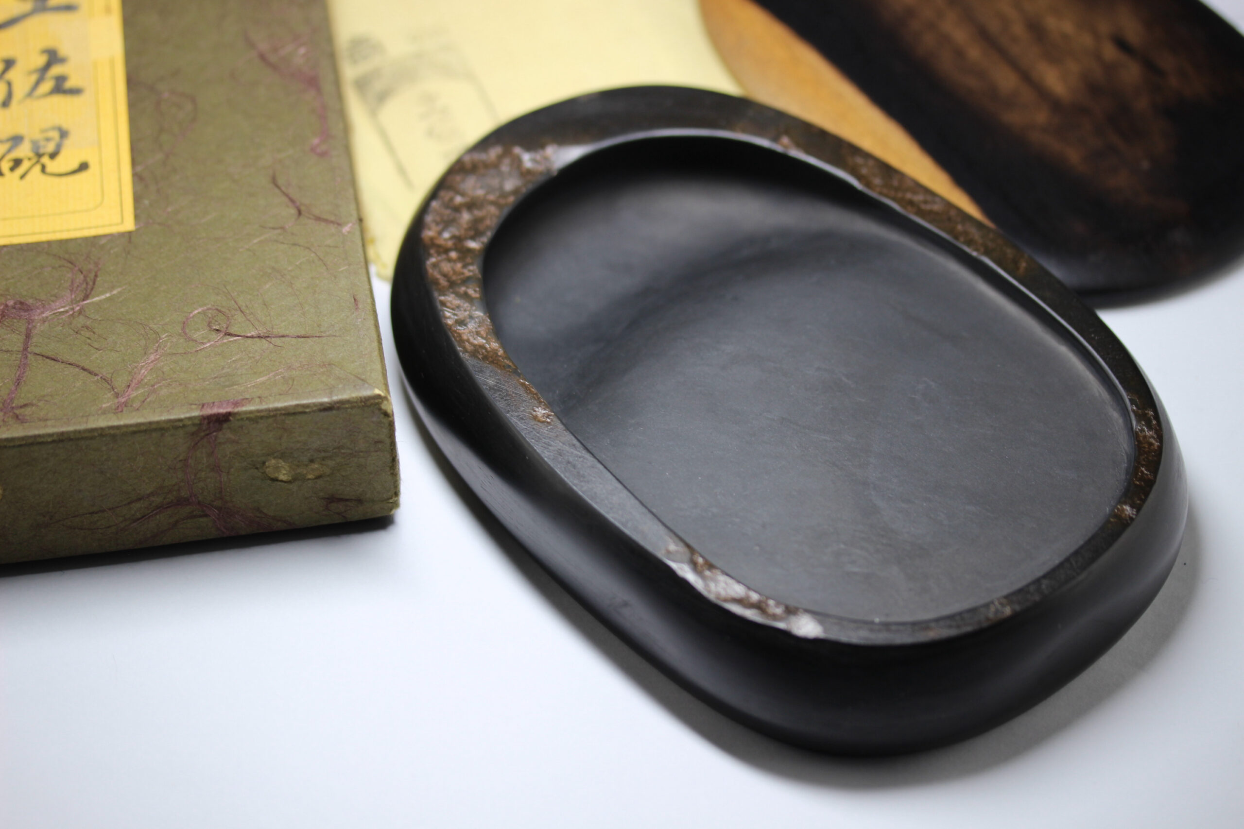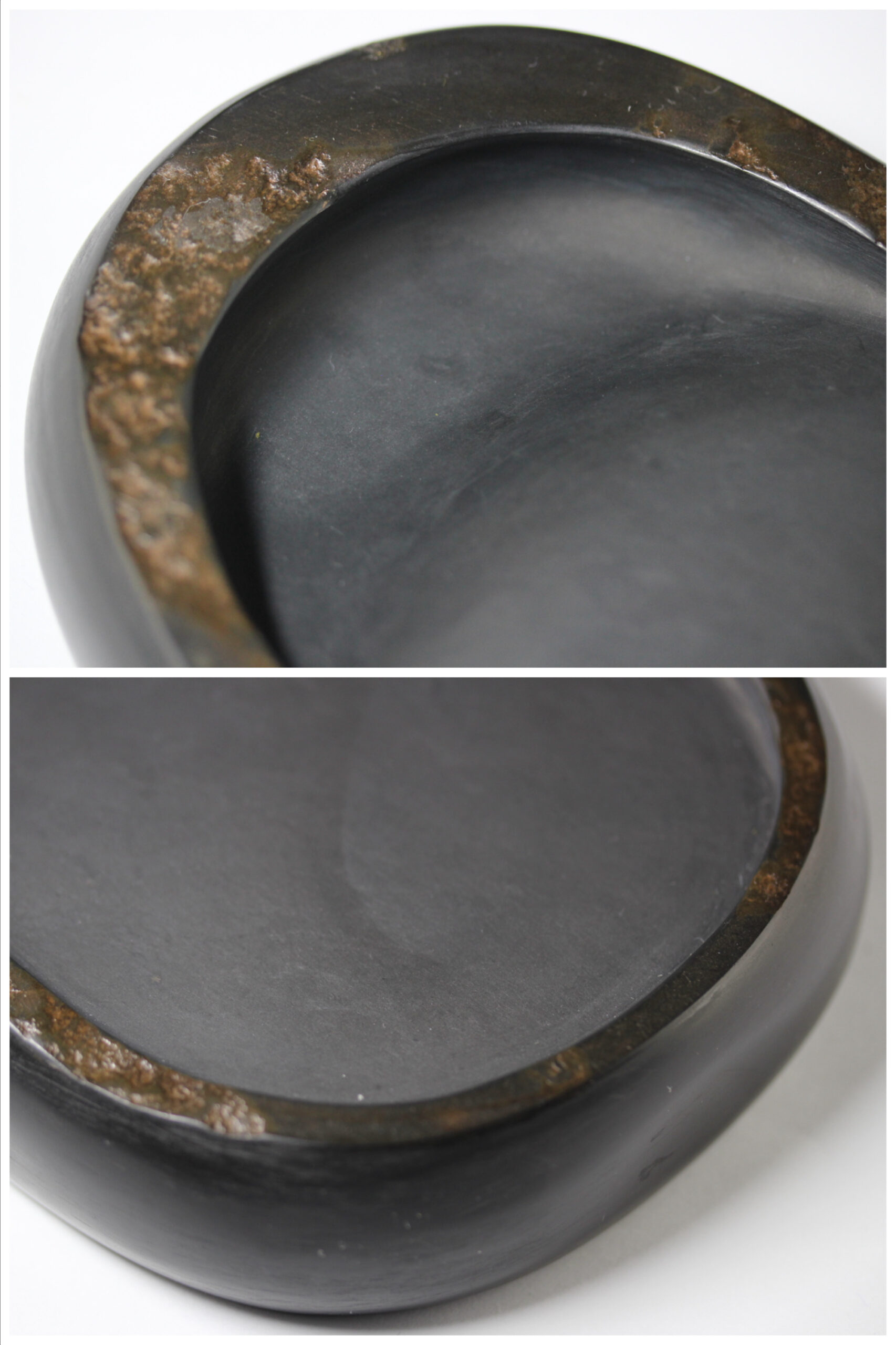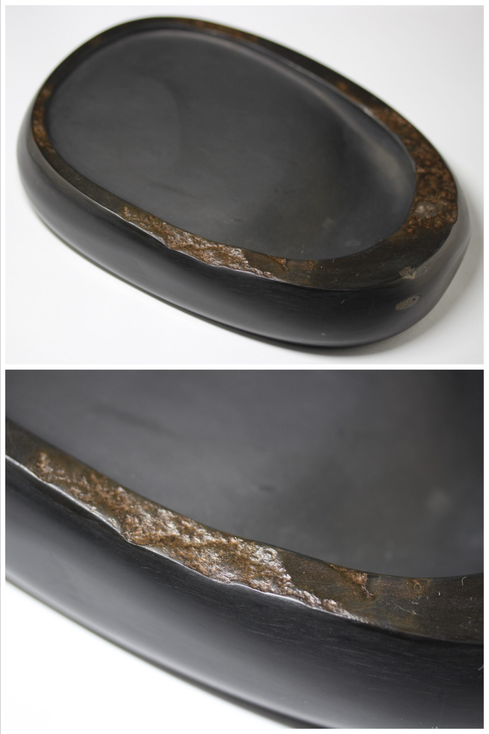 高知県幡多郡三原村源谷で産する硯石。中世代白亜紀須崎層、黒色粘板岩。昭和41年 新谷健吉氏が発見。金星、銀星がみられる蒼黒色の肌理細潤、磨墨に秀れており、「土佐端渓」と称されている。「土佐硯」として登録。表皮を残し、黒柿の銘木を使った硯蓋と相まって雅趣に溢れている。墨堂にはキラキラ輝く金星あり。墨池もたっぷりとしており、硯縁も深く、実用硯としても最適です。