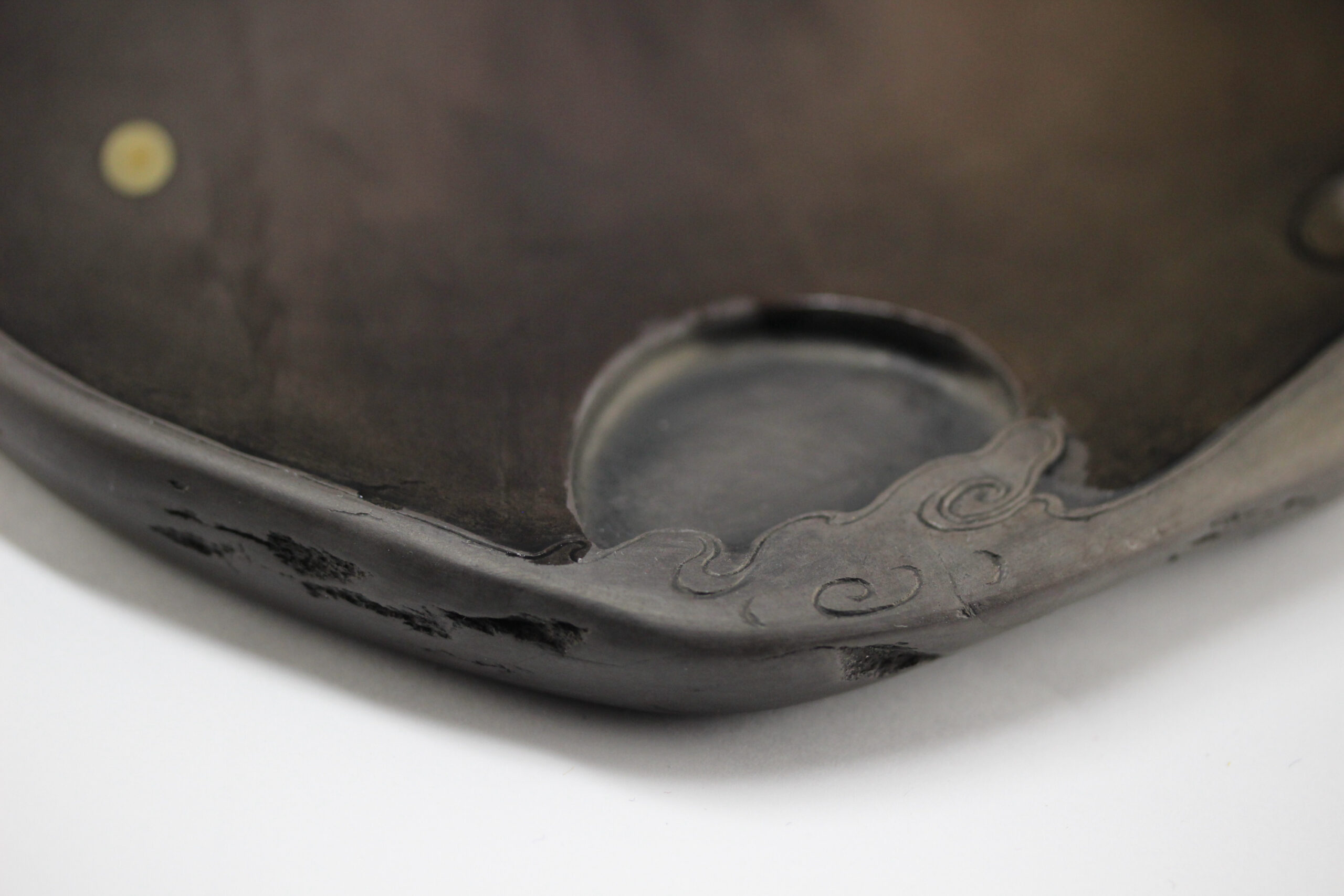[玄清堂]書家所蔵品 端硯 端渓翡翠斑キ龍文硯 硯25.3×15.8×2.9cm 唐木箱【中国文房四宝】