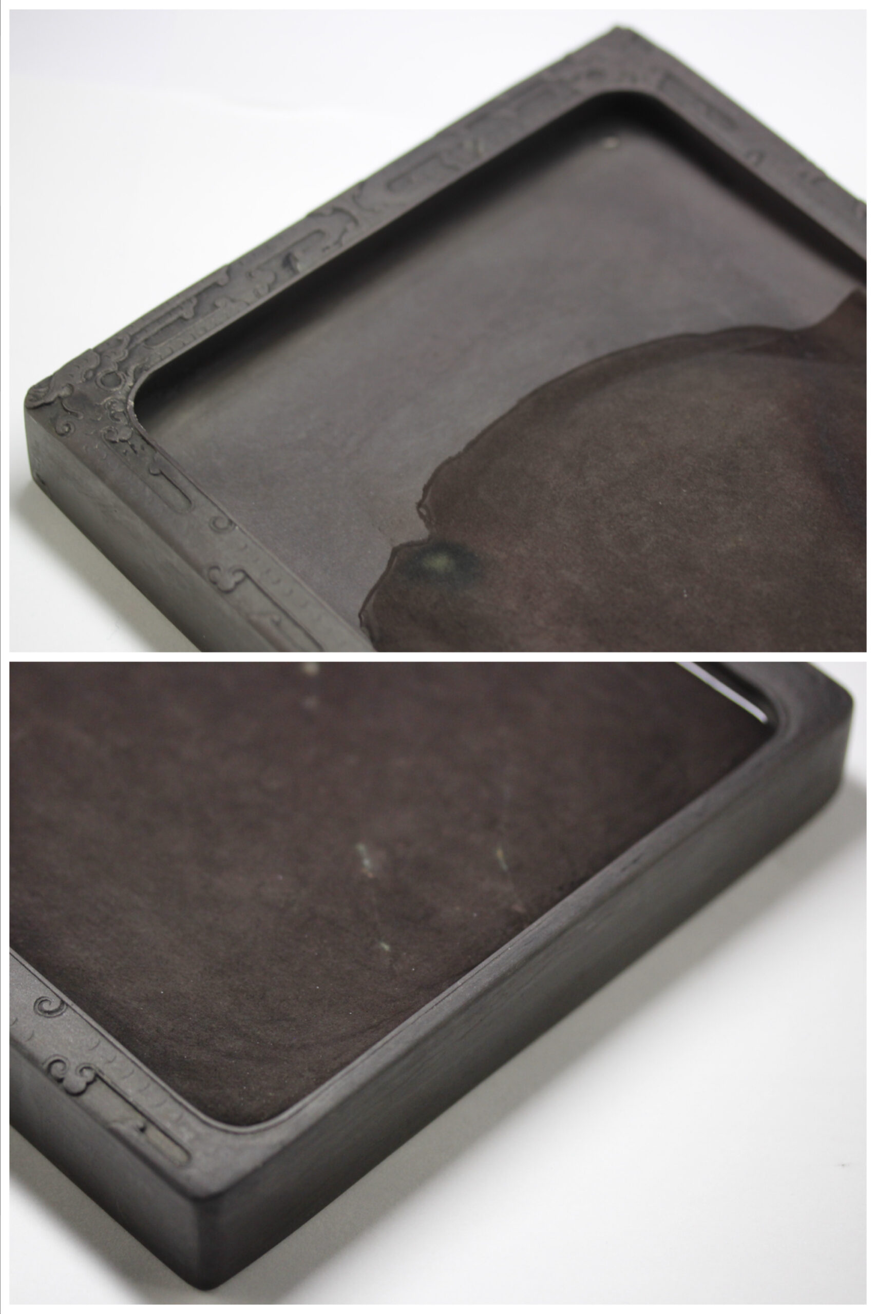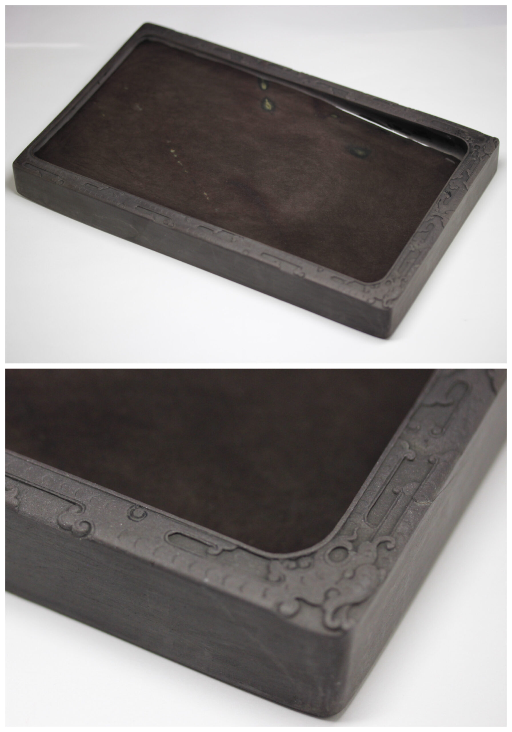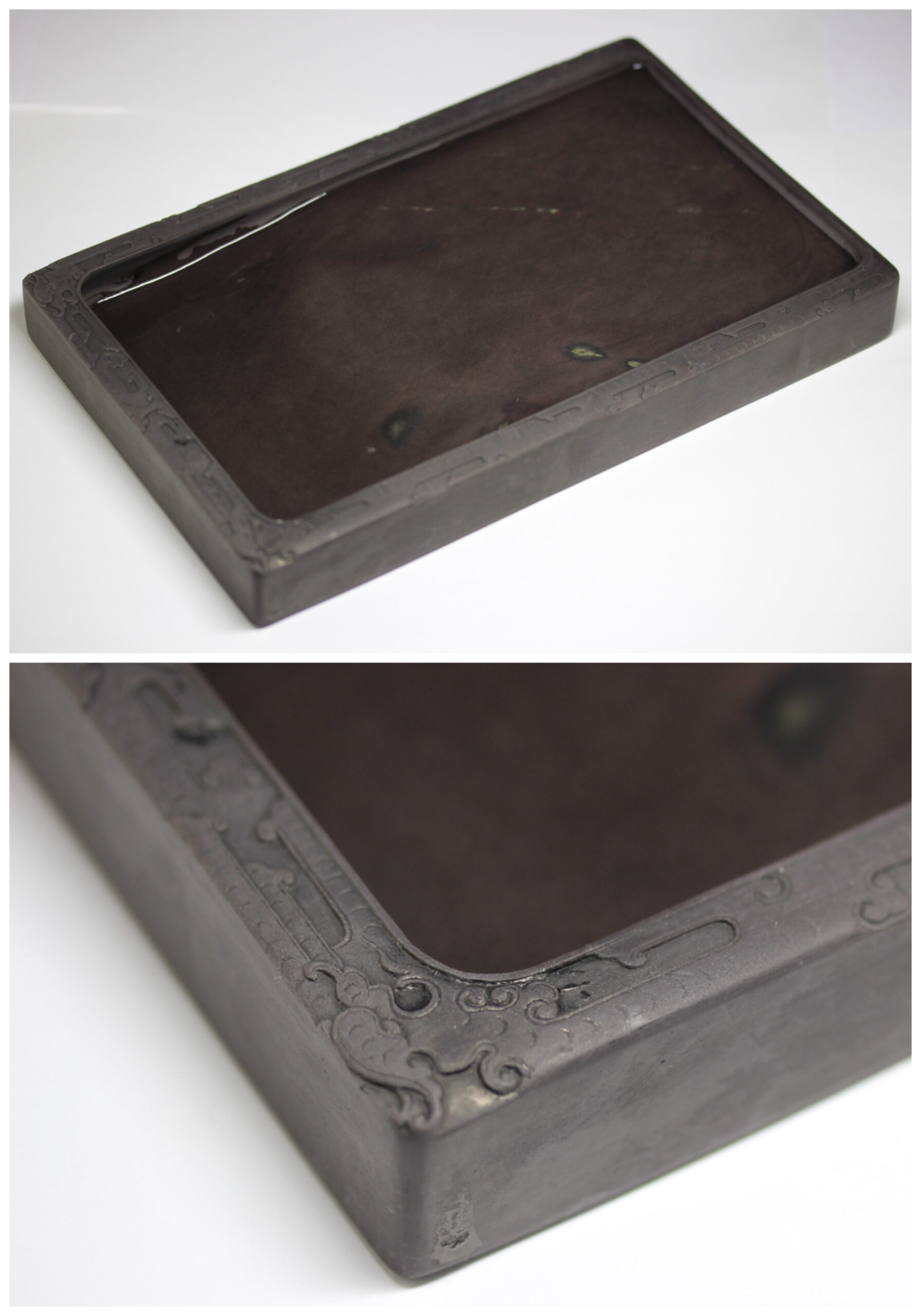 暈を伴った翡翠斑が美麗な磨墨良好な端渓硯です。キ龍文の彫琢、作硯は丁寧で美しい。墨池もたっぷりとしており、硯縁も高く、硯背は硯板として使用でき、書家、書道愛好家に最適な用美一体硯です。