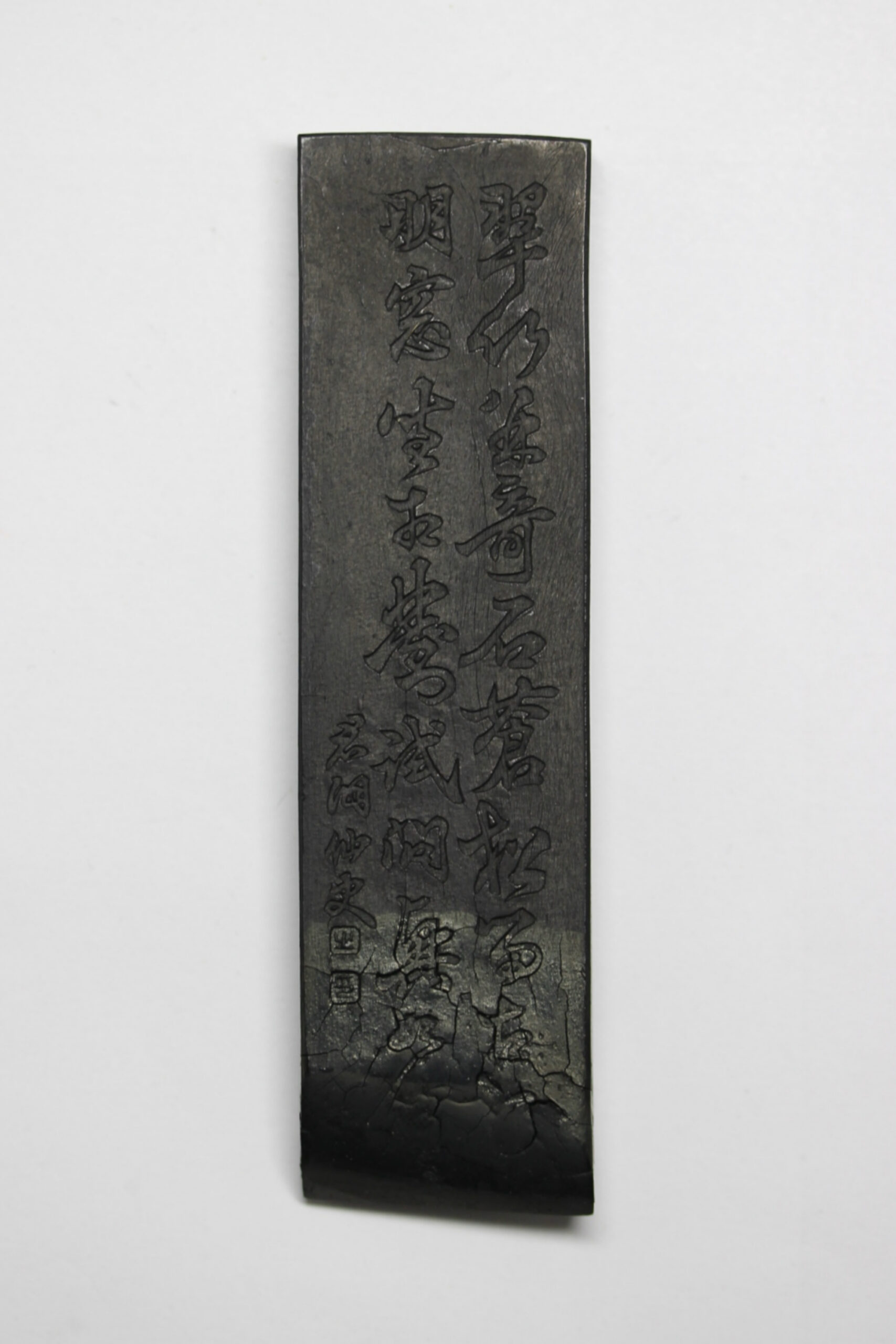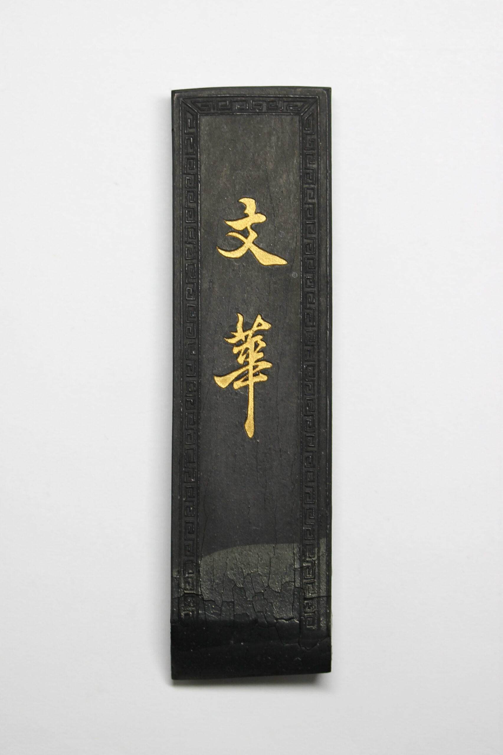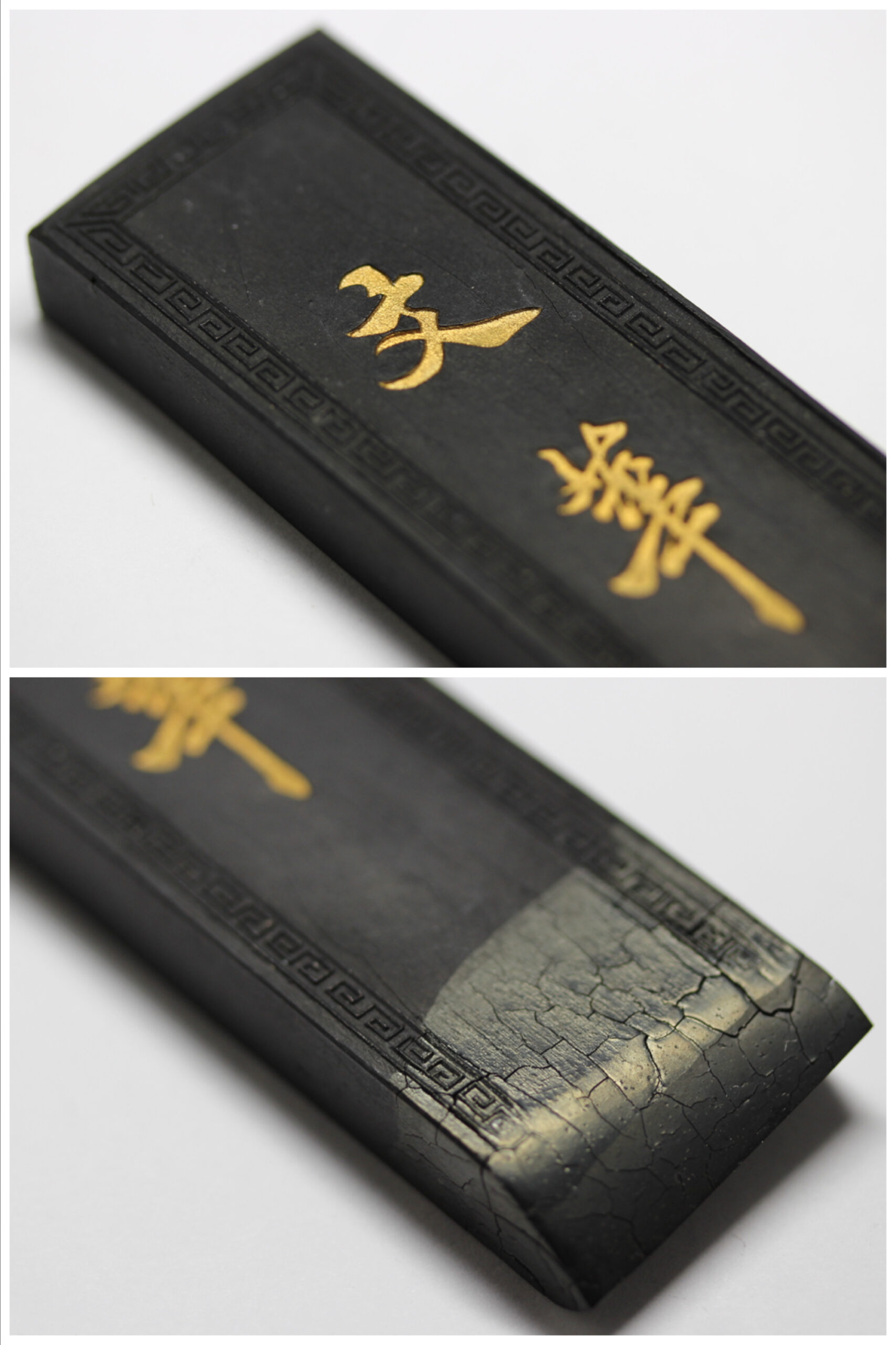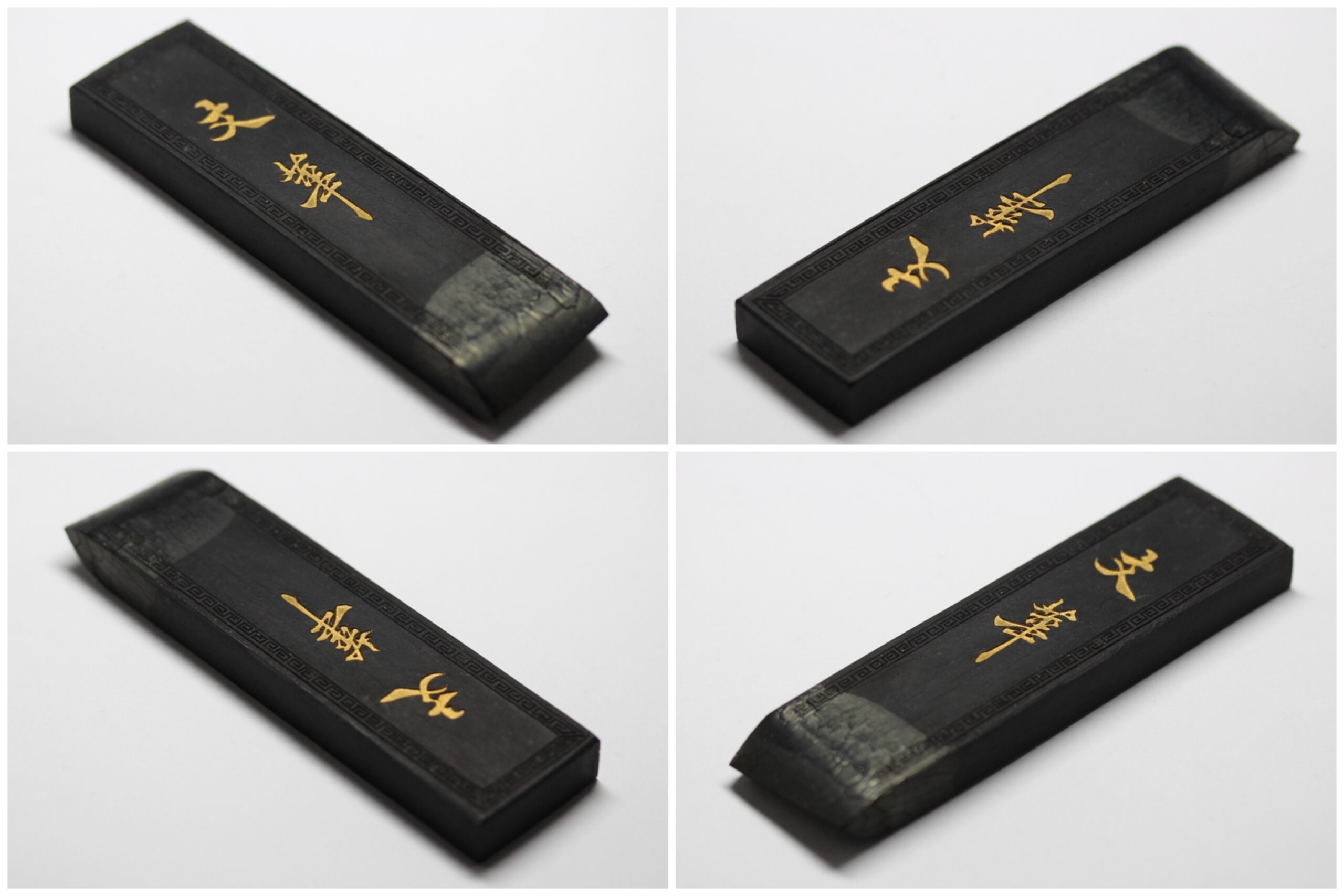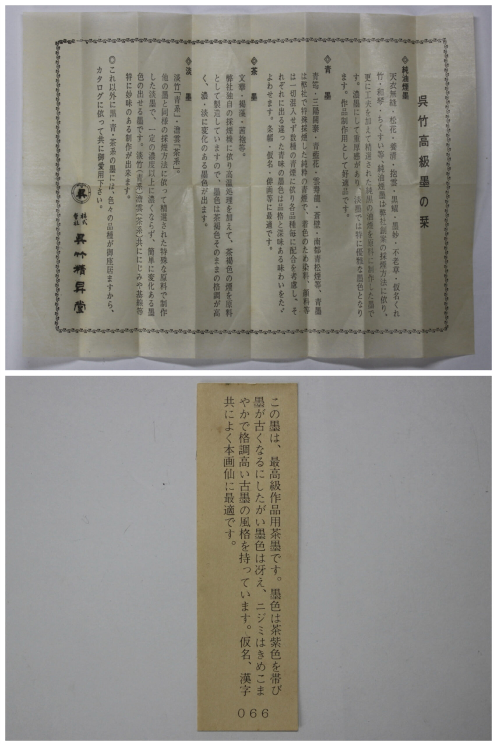 呉竹精昇堂「文華」、茶墨。この墨は、最高級作品用茶墨です。黒色は茶紫色を帯び墨が古くなるにしたがい墨色は冴え、ニジミはきめこまやかで格調高い古墨の風格を持っています。仮名、漢字共によく本画仙に最適です。