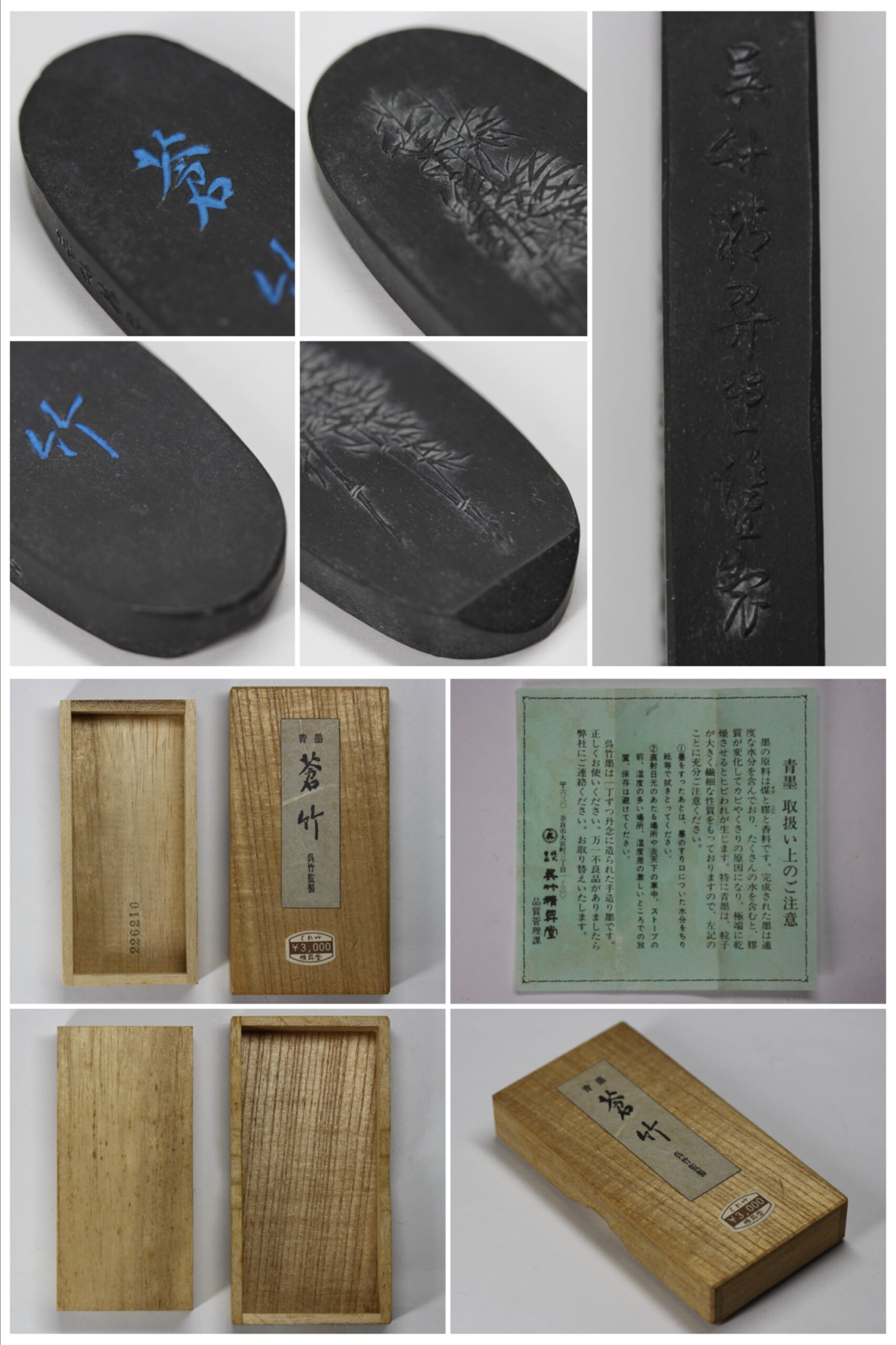 ・呉竹精昇堂 青墨「蒼竹」、2丁型、使用墨、桐箱