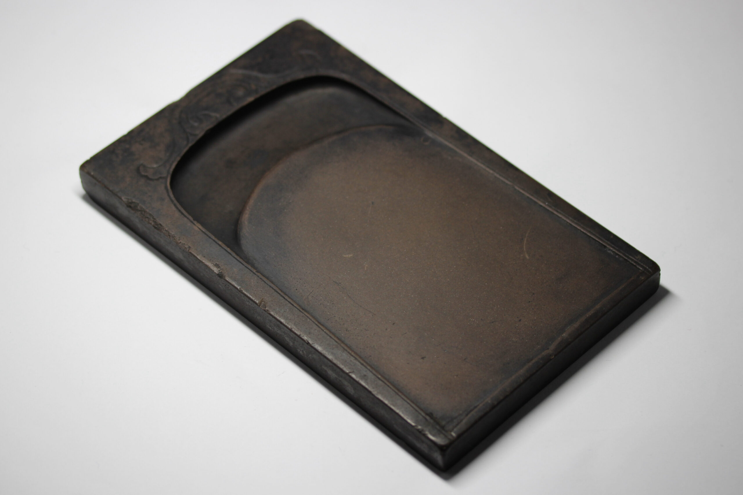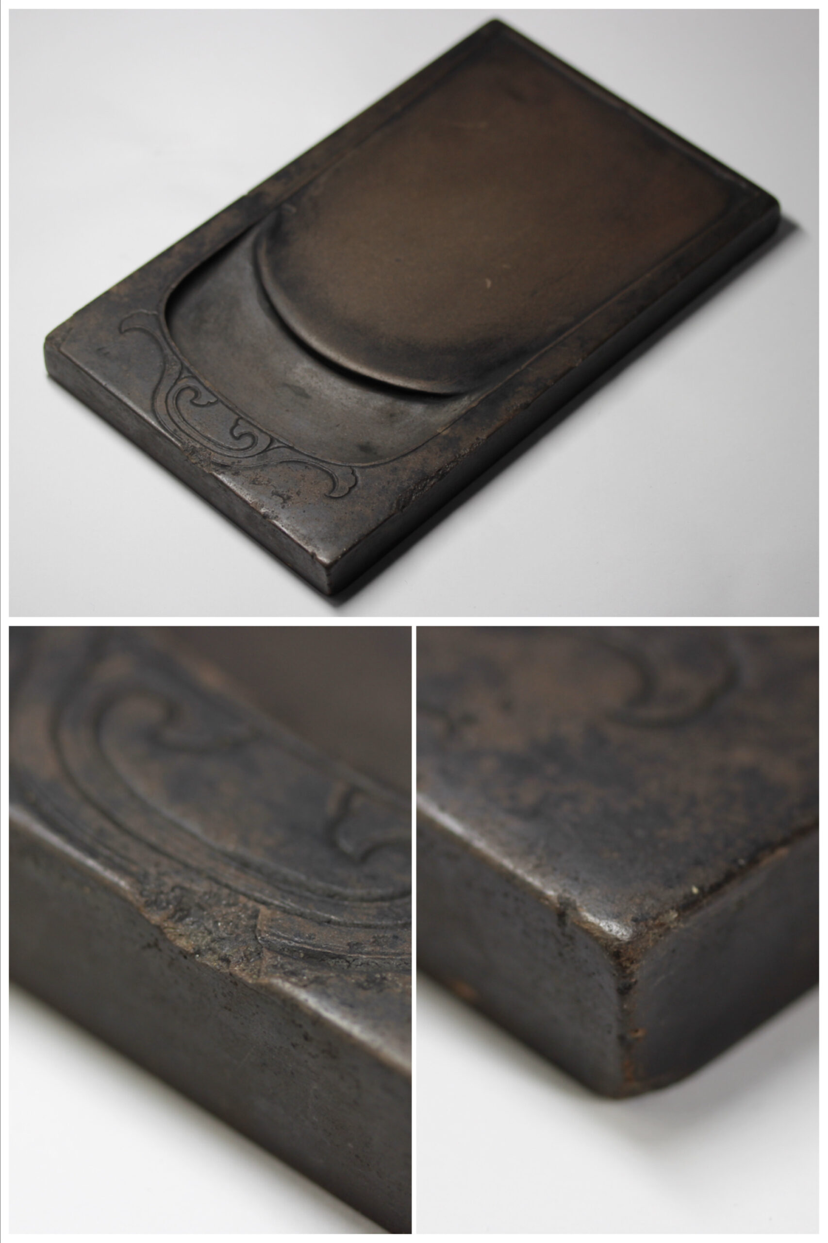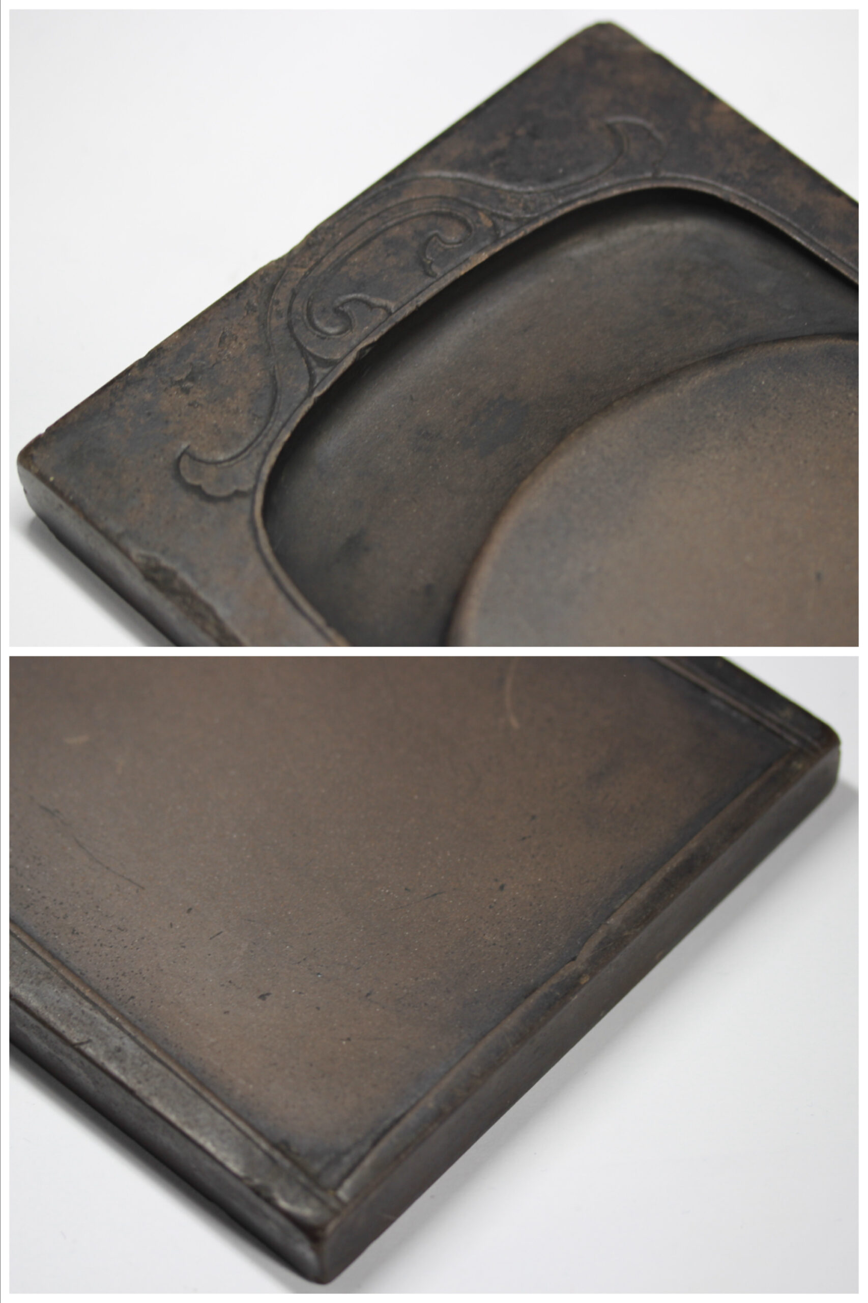唐木箱。中国ではマイ瑰はアカ色ですが、澄泥硯では朱アカ色を蝦頭紅といい、紫色を含むアカ色をマイ瑰紫澄泥といいます。本硯は、極めて肌理が細かい素晴らしい石質の澄泥硯です。硯表はマイ瑰紫澄泥、硯背は蝦頭紅澄泥と石色を楽しめます。鐘様の彫琢。石質、石色、彫琢と品格に溢れる古硯です。