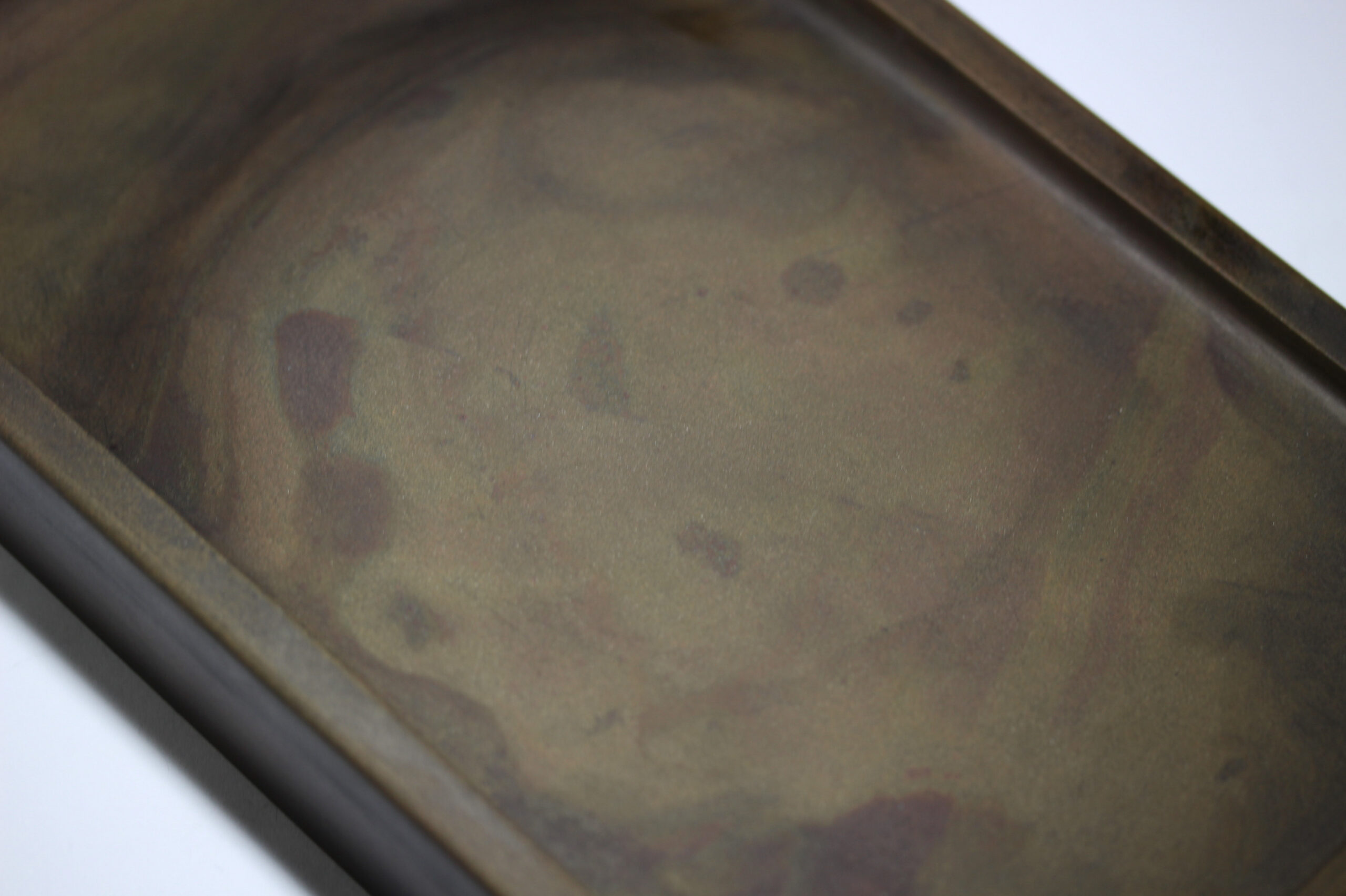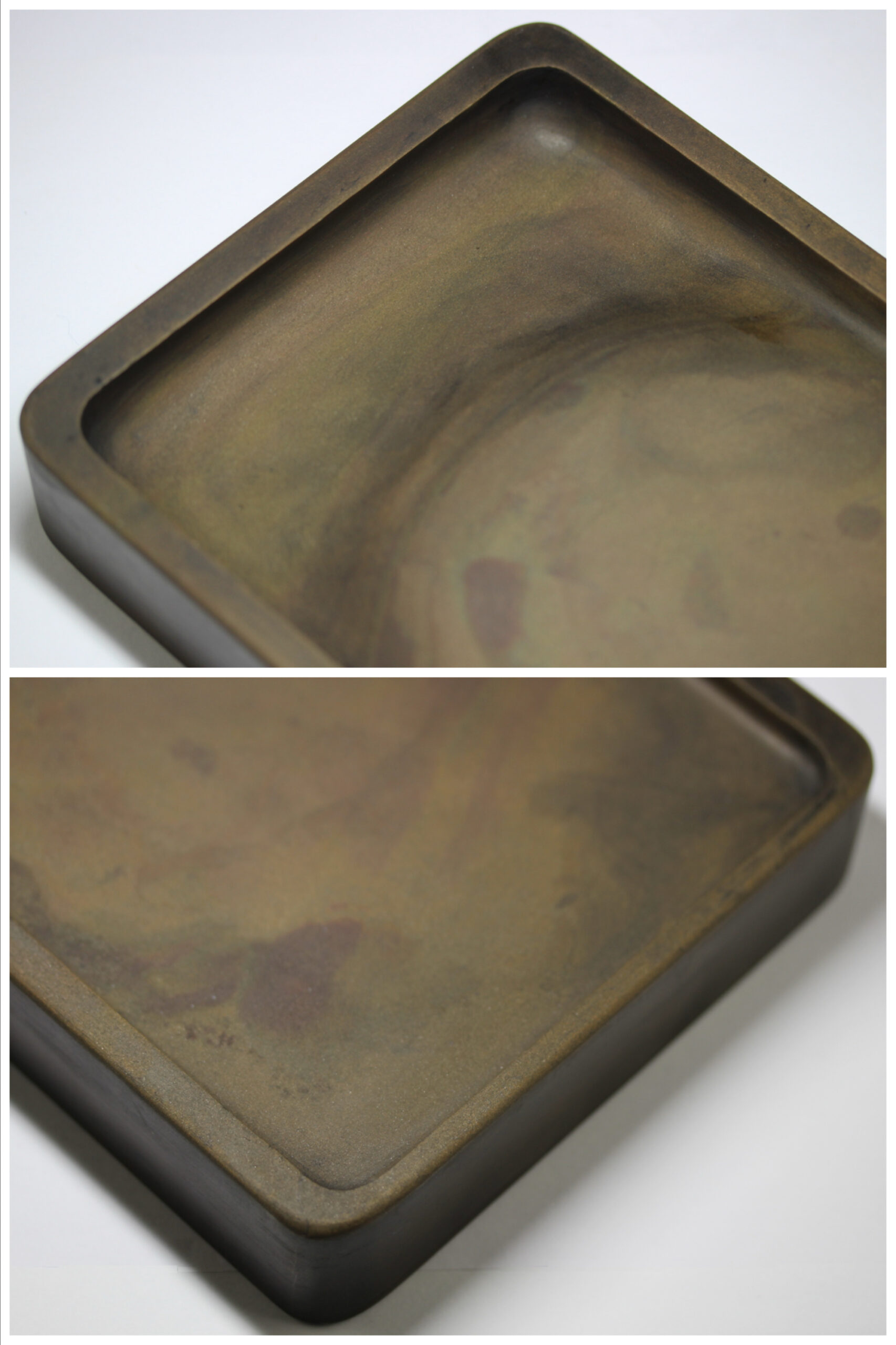 大珍品。澄泥硯には、鱔魚黄、蟹殻青、緑豆沙、蝦頭紅、玫瑰紫、魚肚白、朱沙澄泥の七彩がありますが、本硯は七彩が斑紋となって美観を呈しています。さらに肌理温潤な稀少材の黄泥でもあります。今だかつてこの様な澄泥硯を見たことがありません。