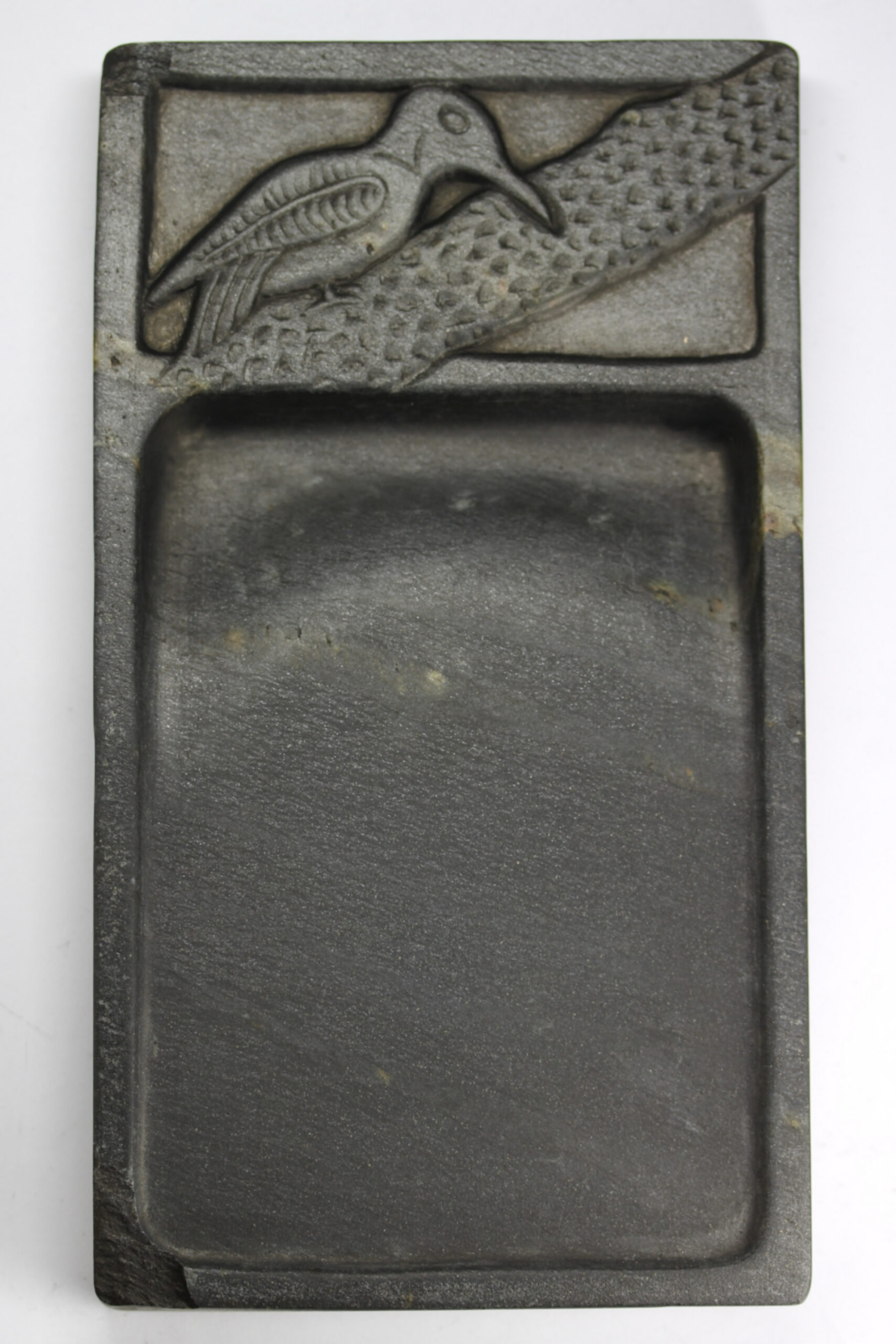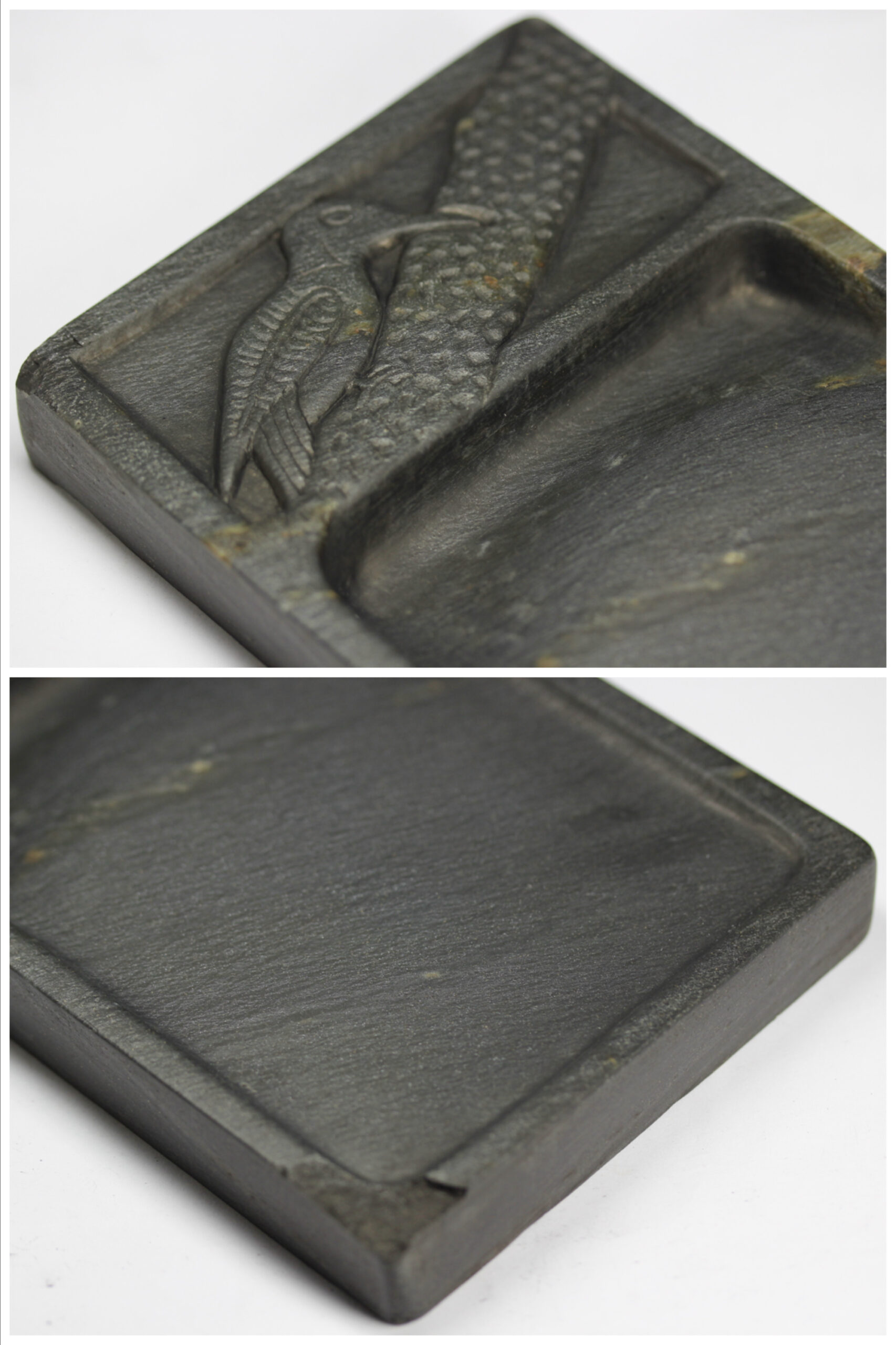 [玄清堂]魯硯 駝基島石銀花雪浪文・啄木鳥硯 硯17.8×9.9×1.9cm 木箱【中国文房四宝】